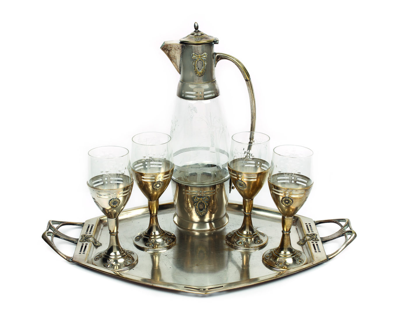 Serviciu format din tavă hexagonală cu anse, 4 pahare din sticlă cu suport metalic și carafă din sticlă montată în metal. Decor de inspirație neoclasică: cununi de lauri, motive geometrice și florale.