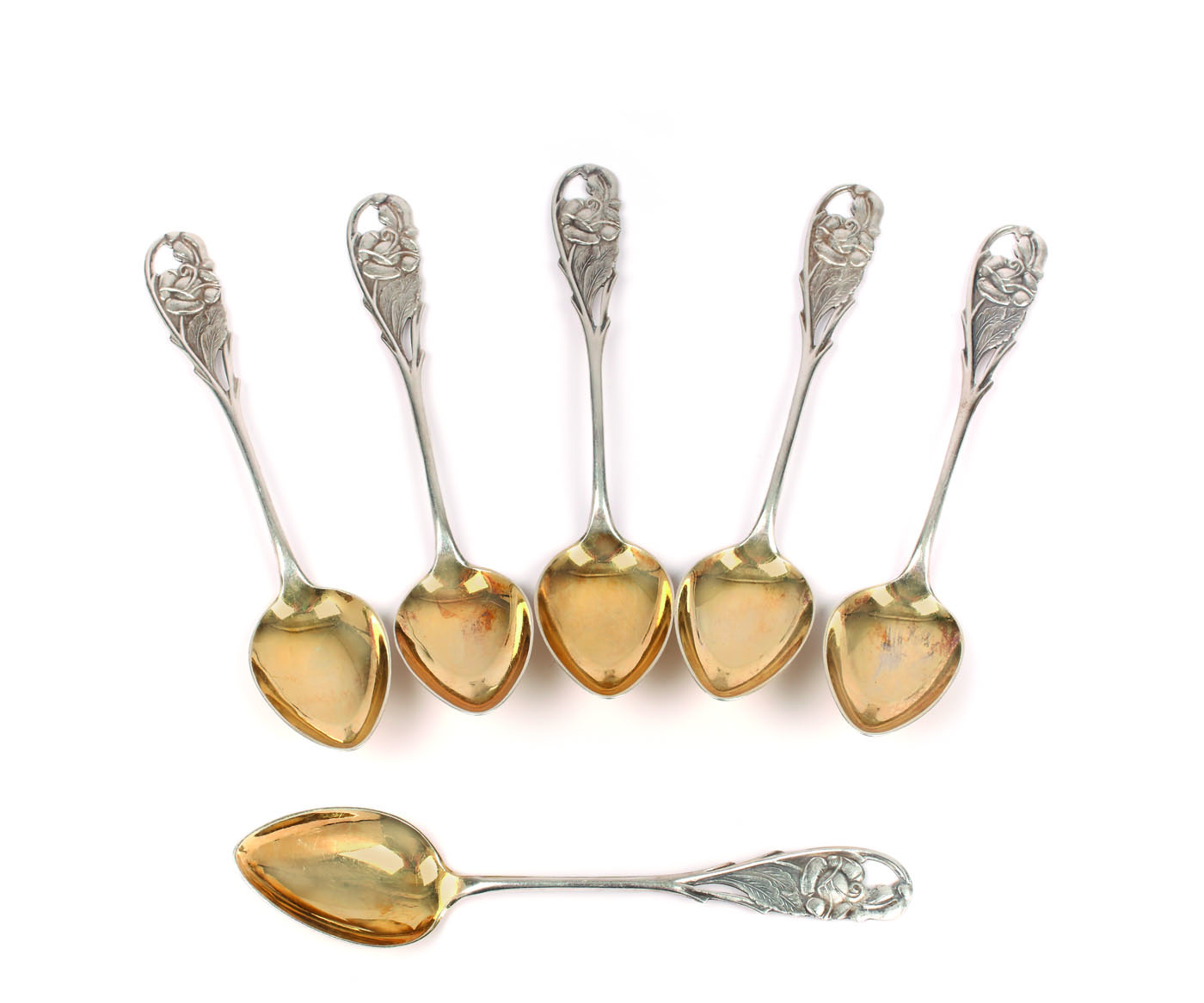 Set de șase lingurițe, cu căuș aurit, cu mâner ajurat cu flori de mărgăritar.