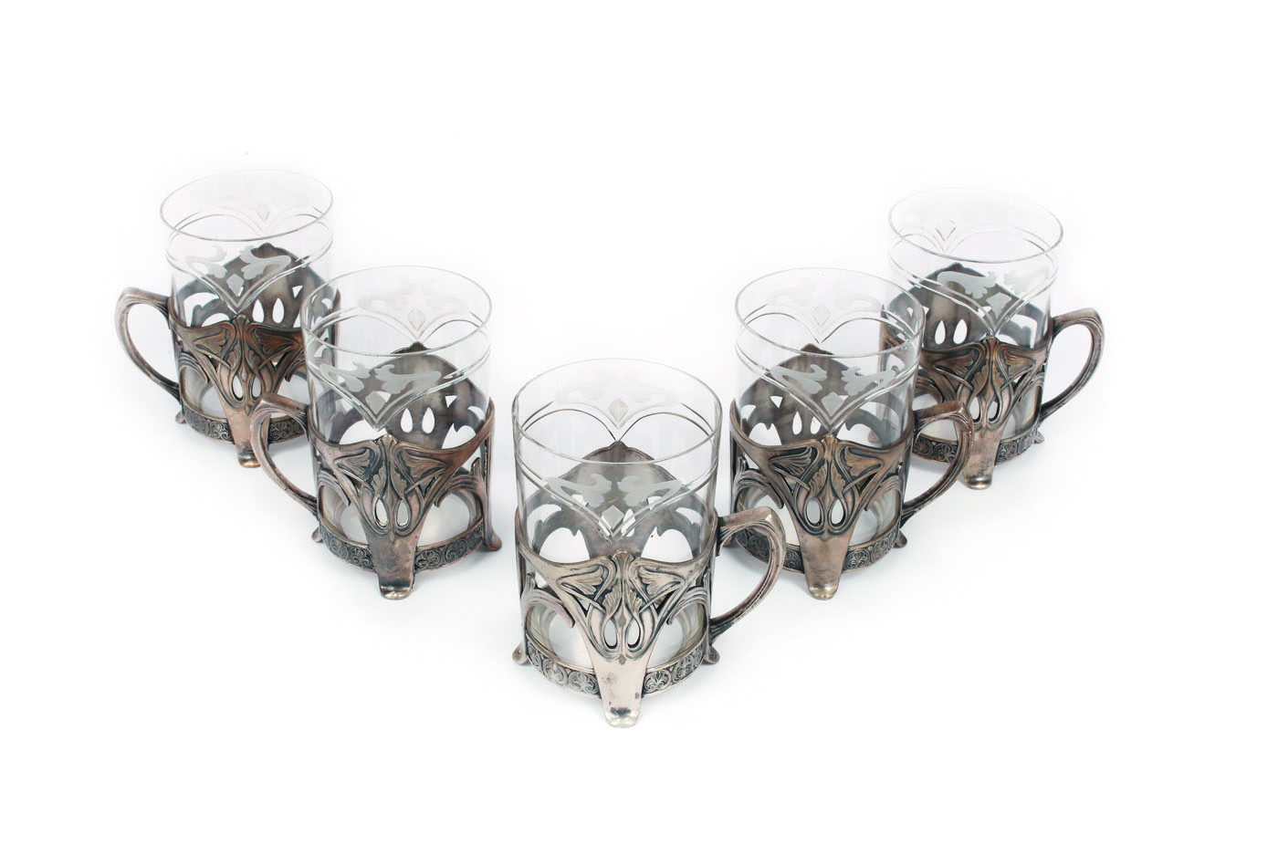 Set de cinci pahare, din sticlă, cu decor gravat lambrechin floral-vegetal la buză, în suporturi metalice ajurate, cu motiv vrejuri vegetale și crini heraldici.