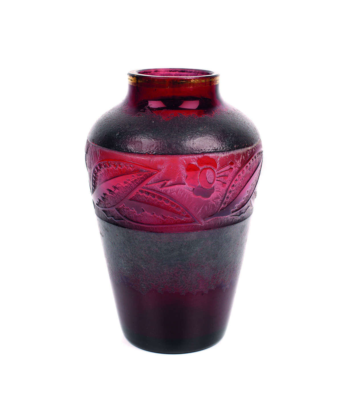 Vas piriform, de culoare roșu-rubiniu, cu bandă decorativă motiv floral-vegetal gravat în relief. În stil Art Deco.