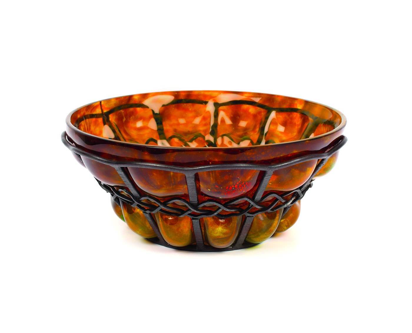 Bol pe talpă circulară, evazat spre buză, corpul cu 2 registre cu lobi godronaţi, de culoare chihlimbar, susţinut de reţea metalică.