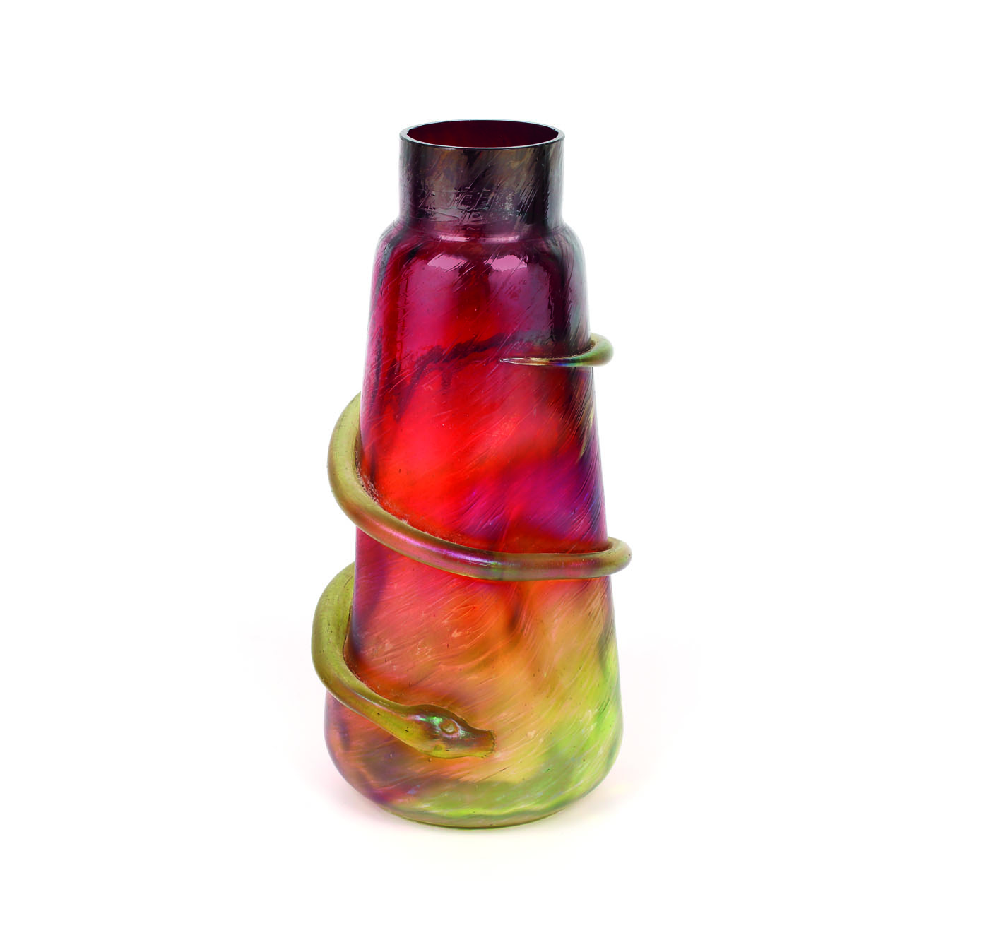 Vas tubular, îngustat spre buză, corp modelat manual, cu irizări metalice și decor aplicat șarpe.