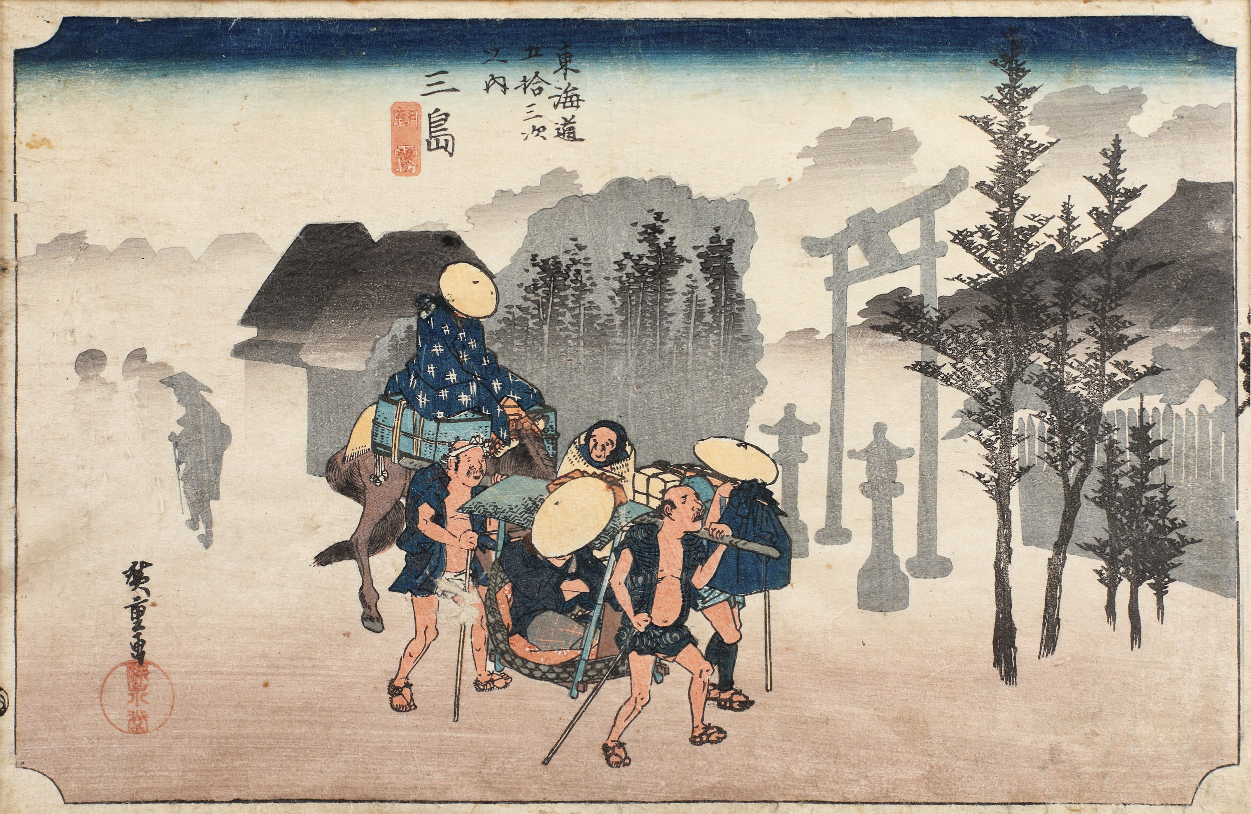 Gravura lui Andō Hiroshige (1797 – 1858) face parte din celebra sa serie Cele 53 de stații pe Tokaidō, realizată între anii 1833-1834. În conceperea acestei serii artistul a fost inspirat de tema popasurilor făcute de călători pe faimosul drum Tokaidō, cu o lungime de peste 500 km, care lega capitala administrativă Edo de cea imperială Kyoto. Xilogravura redă al 17-lea popas din serie, în zorii zilei. Compoziția înfățișează în prim-plan doi hamali, care poartă o litieră kago, urmați de un alt drumeț călare. În partea dreaptă, prin ceața dimineții, poate fi zărită poarta torii a sanctuarului shintō Daimyōjin din Mishima.