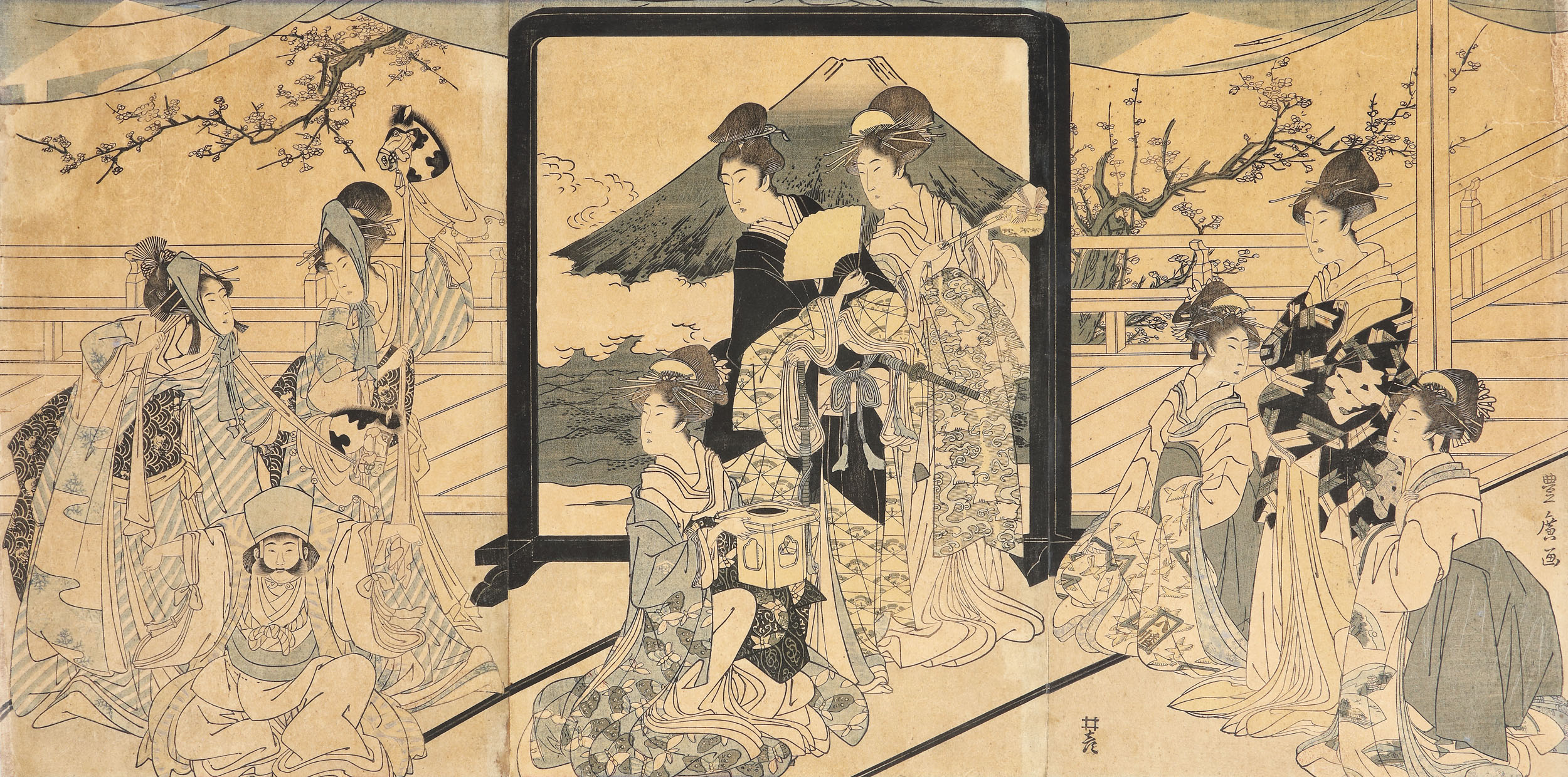 Utagawa Toyohiro (1773-1828) a fost un important artist al genului Ukiyo-e, activ la începutul secolului al XIX-lea. Elev al lui Utagawa Toyoharu (1735-1814), fondatorul școlii care îi și poartă numele, Toyohiro s-a evidențiat în xilogravura nishiki-e în special prin compoziții care înfățișează femei frumoase (bijin-ga). De asemenea, aportul său în dezvoltarea peisajului ca gen de sine stătător în stampa Ukiyo-e nu poate fi trecut cu vederea. Tripticul său, o piesă rară de colecție, redă un grup de femei din înalta societate, care asistă la un spectacol tradițional, de dans, cu cai de jucărie. Muntele Fuji apare central, pictat pe un paravan, printre nori. Prunii înfloriți din fundalul compoziției fac trimitere, într-un mod specific japonez, la faptul că acțiunea se petrece primăvara.