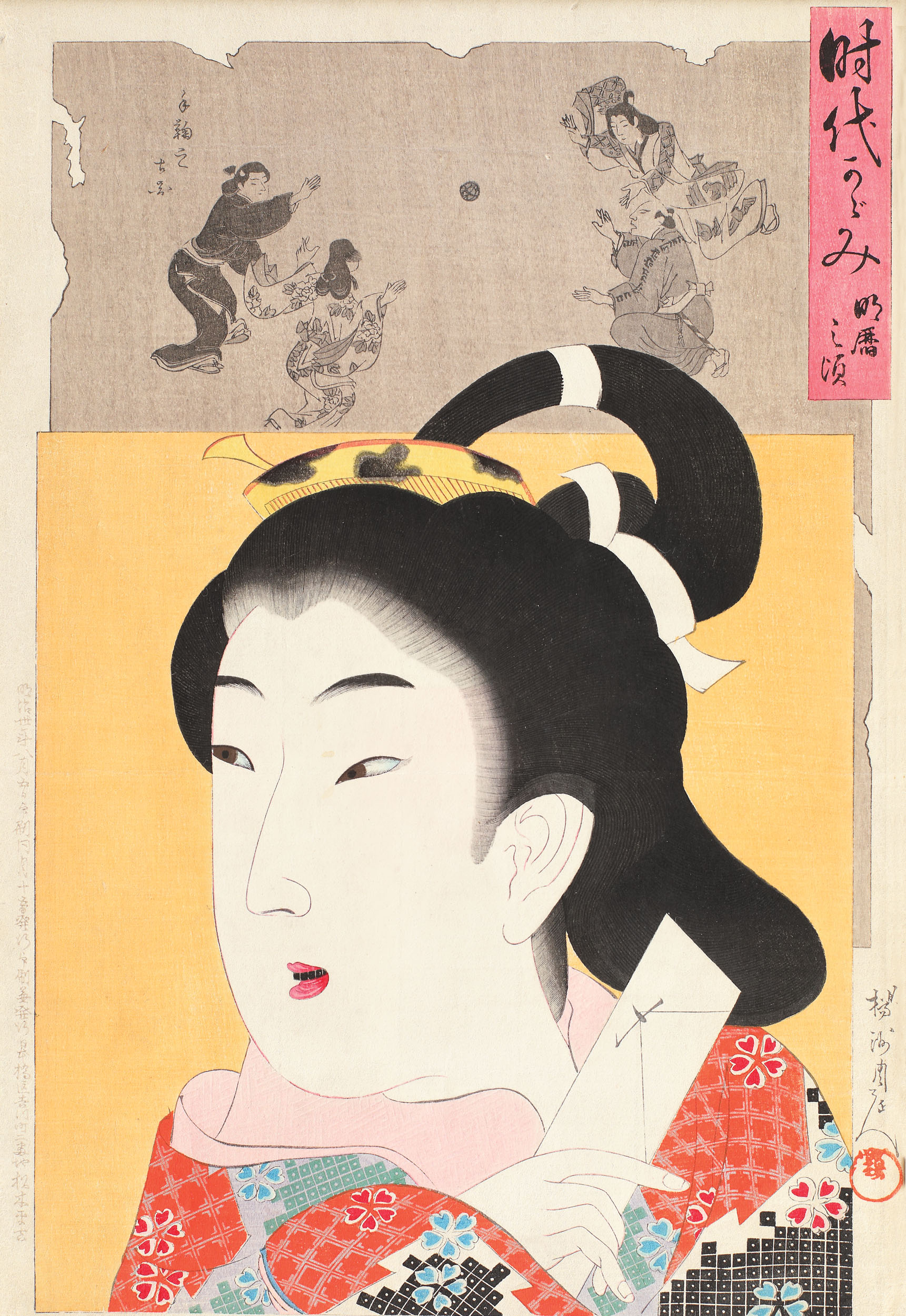 Într-un context cultural care promova, pe fondul occidentalizării pronunțate, o revizitare a vechilor tradiții și obiceiuri nipone, Toyohara Chikanobu (1838–1912) realizează, începând cu anul 1896, în colaborare cu editorul Matsuki Heikichi, seria Oglinda vremurilor (Jidai kagami). În această serie Chikanobu propunea o documentare și totodată o celebrare a modei, de la îmbrăcăminte și până la coafură sau accesorii, a femeii japoneze de-a lungul veacurilor. Influența unor maeștri din perioada Edo, precum Utamaro sau Sharaku,este evidentă în designul compozițiilor. Calitatea stampelor din această serie, executată într-o ediție de lux, este remarcabilă.