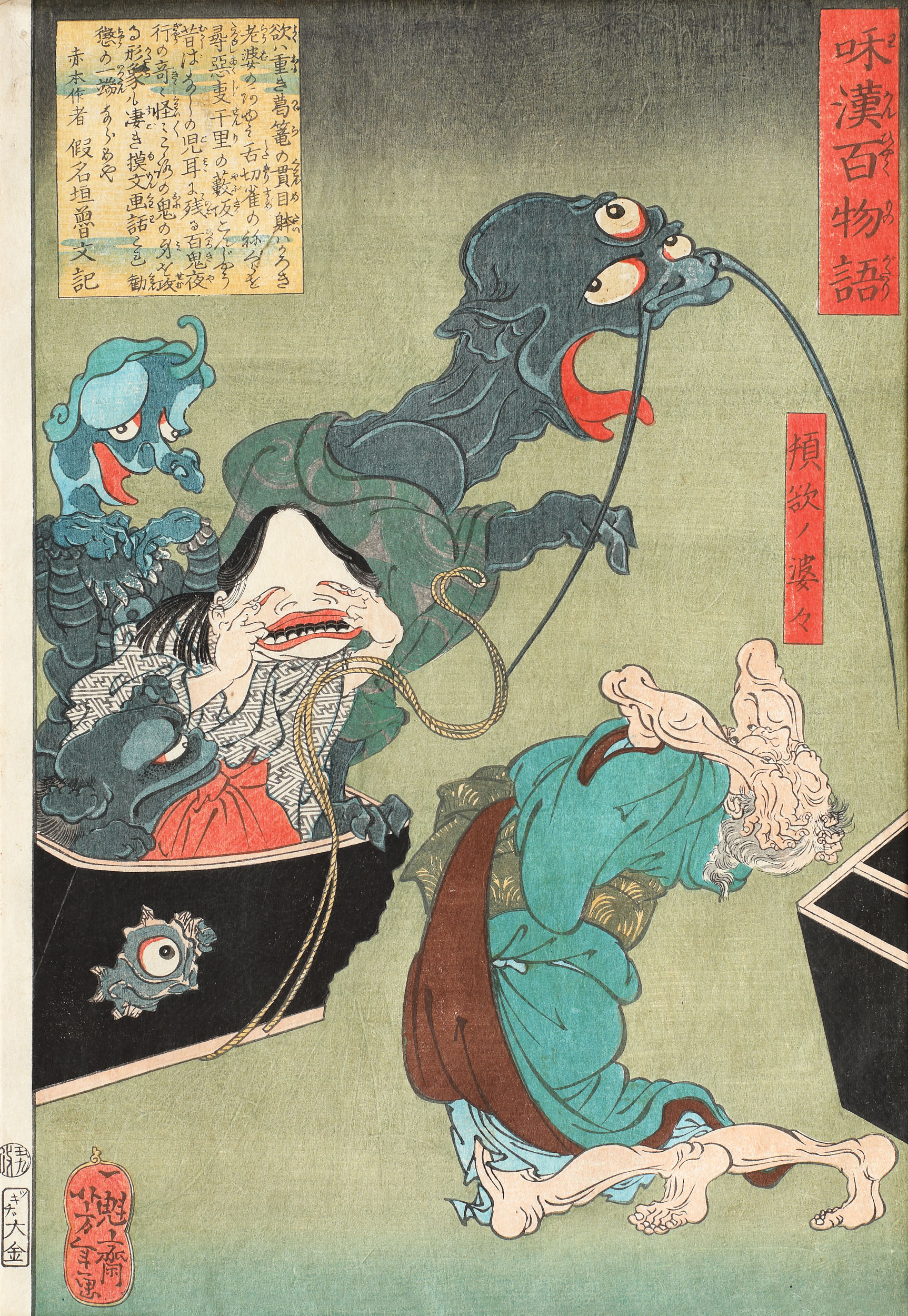 Gravura lui Tsukioka Yoshitoshi (1839-1892), cel considerat a fi ultimul maestru al genului Ukiyo-e, face parte din cunoscuta sa serie ”O sută de povești cu stafii din China și Japonia (Wakan hyaku monogatari)”. Stampa redă vechea poveste japoneză a vrabiei-cu-limba-tăiată (Shitakiri suzume), în care se spune că trăia odată un bătrân, care s-a împrietenit cu o vrabie, pe care o hrănea în fiecare zi. Atunci când, într-o seară, pasărea nu a mai apărut, a aflat că vecina sa, o bătrână ursuză, i-a tăiat limba, după ce a prins-o mâncând neinvitată din pasta sa de orez. Bătrânul a plecat în pădure să o caute iar vrabia, pentru a-i răsplăti mărinimia, l-a invitat să aleagă între două cufere. Smerit, omul îl alege pe cel mic iar acasă constată că era plin de bogății. La auzul acestei întâmplări bătrâna a mers și ea în pădure să caute vrabia. Bună la suflet, pasărea o lasă și pe ea să aleagă un cufăr. Lacomă, femeia îl alege pe cel mare. Gravura prezintă deznodământul poveștii, momentul în care din cufăr ies creaturi mitice, care o atacă pe bătrâna îngrozită de ceea ce vede. Deși terifiante pentru femeie, aceste creaturi sunt înfățișate de către Yoshitoshi într-o manieră plină de umor, menită să aducă un zâmbet pe fața privitorilor.