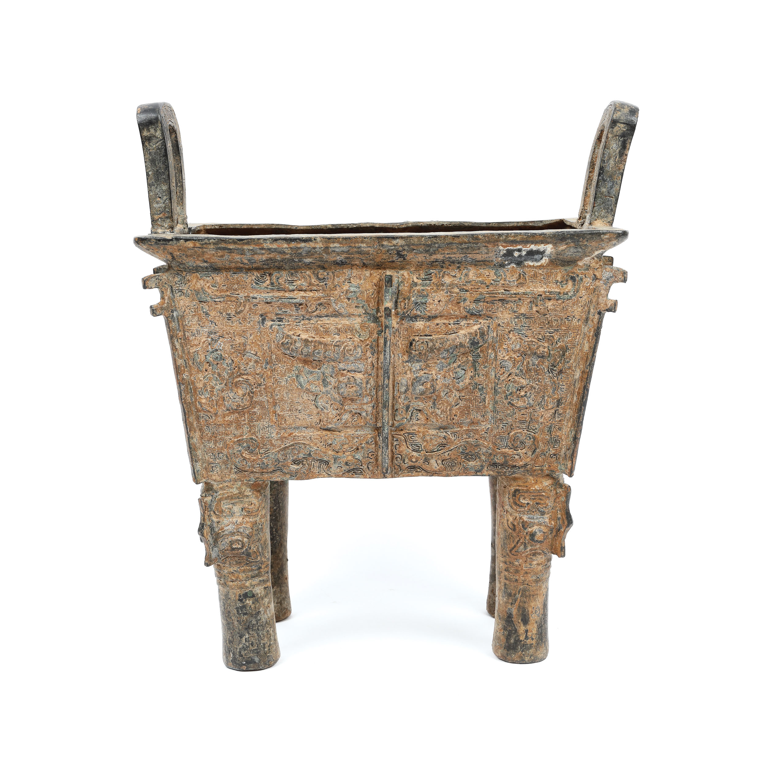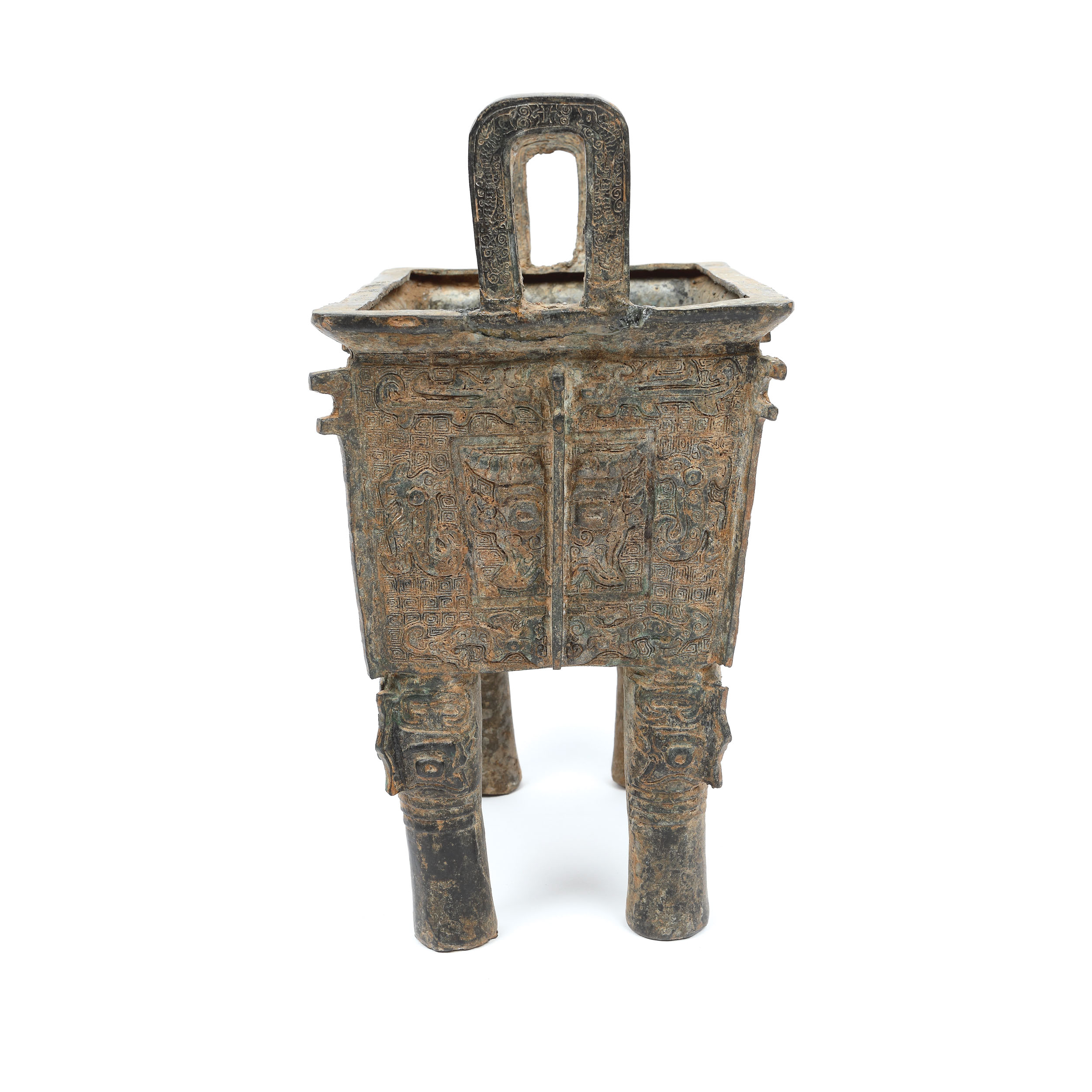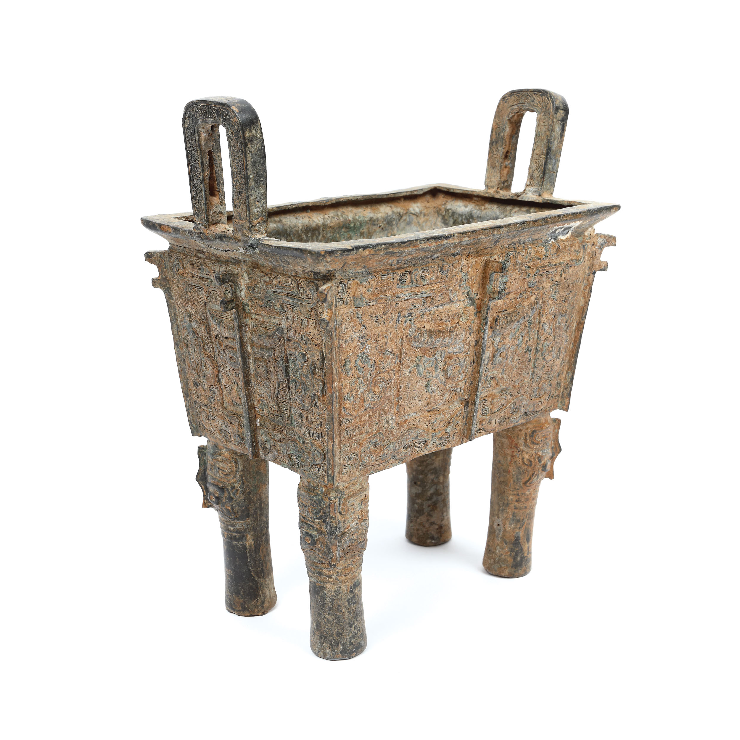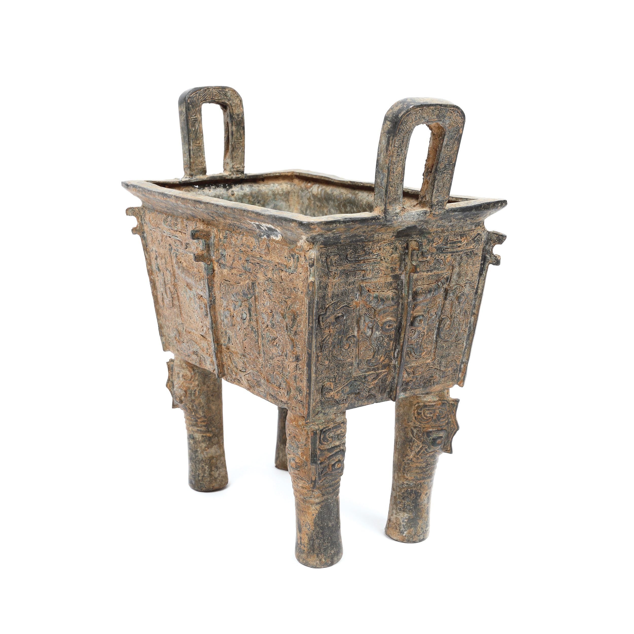”Fang ding” se numără printre cele mai rare vase ritualice din Epoca Bronzului, iar lotul prezent, decorat cu o motivul bovideului pe fond de leiwen și măști taotie, este un exemplu excepțional și se numără printre cele mai spectaculoase de acest gen. Forma sa rectangulară și dimensiunea conferă acestui vas un sentiment de echilibru și armonie, în timp ce patina verde care s-a dezvoltat uniform pe suprafața sa înfrumusețeză designul. Vasele ritualice de tip ”fang ding” (pătrate) au o istorie îndelungată în China. Ele au fost mai întâi fabricate din ceramică în perioada Erlitou (2000-1500 Î.E.N) și au fost ulterior fabricate din bronz în perioada Erligang (1510-1460 Î.E.N.). În dinastiile Shang și Zhou de Vest, fang ding-urile erau făurite pentru a fi folosite în practicarea cultului strămoșilor sau alte ceremonii de sacrificiu, iar dreptul de proprietate asupra lor pare să fi fost strict reglementat. În timpul dinastiei Zhou de Vest, micii nobili ai Chinei feudale primeau dreptul de a deține trei astfel de vase (fiecare), înalții ofițeri cinci, demnitarii șapte și Împăratul nouă.