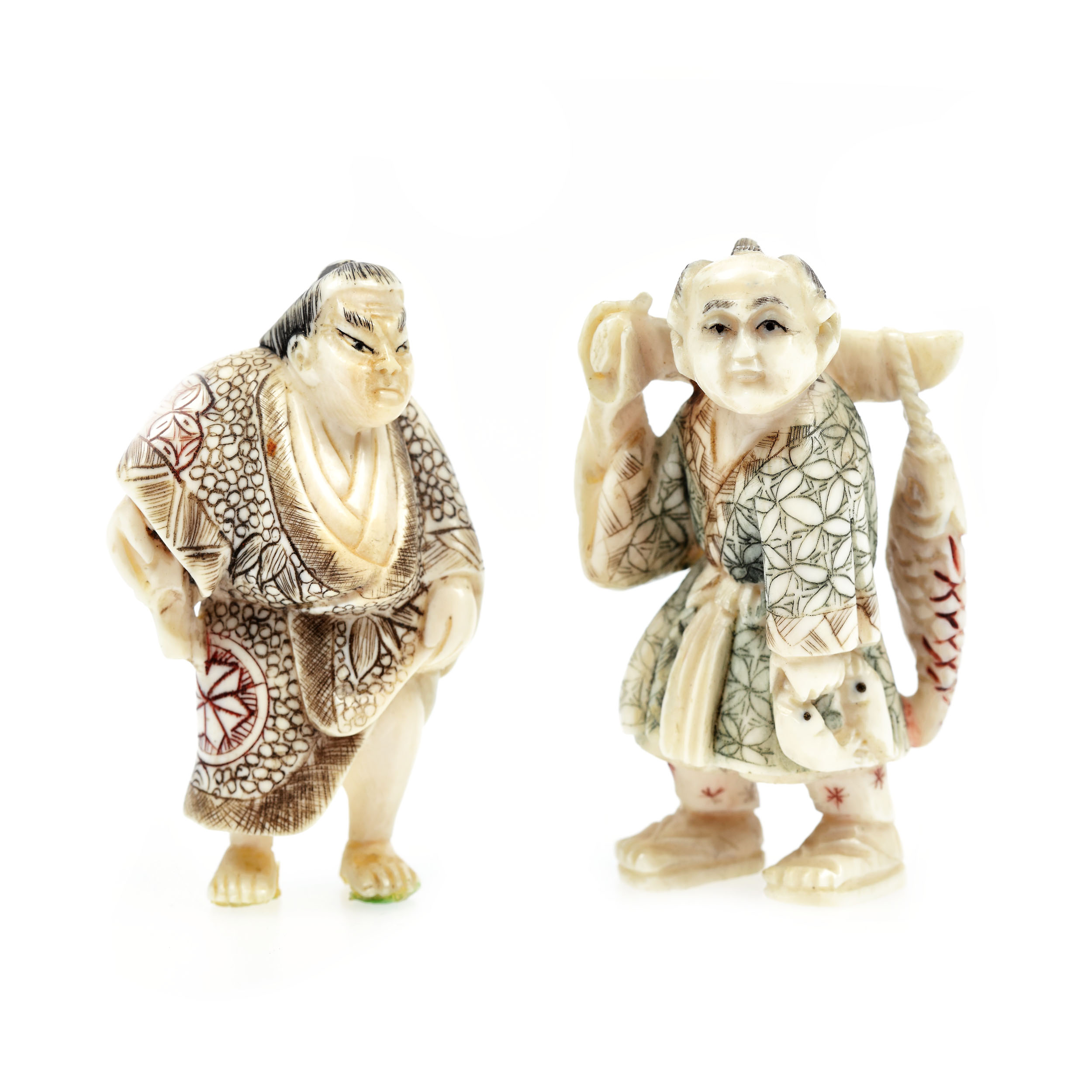 108. Lot format dintr-un netsuke și o statuetă miniaturală din fildeş înfățișând un vânzător de pește și un agent fiscal, sfârșitul perioadei Meiji, Japonia, cca. 1900