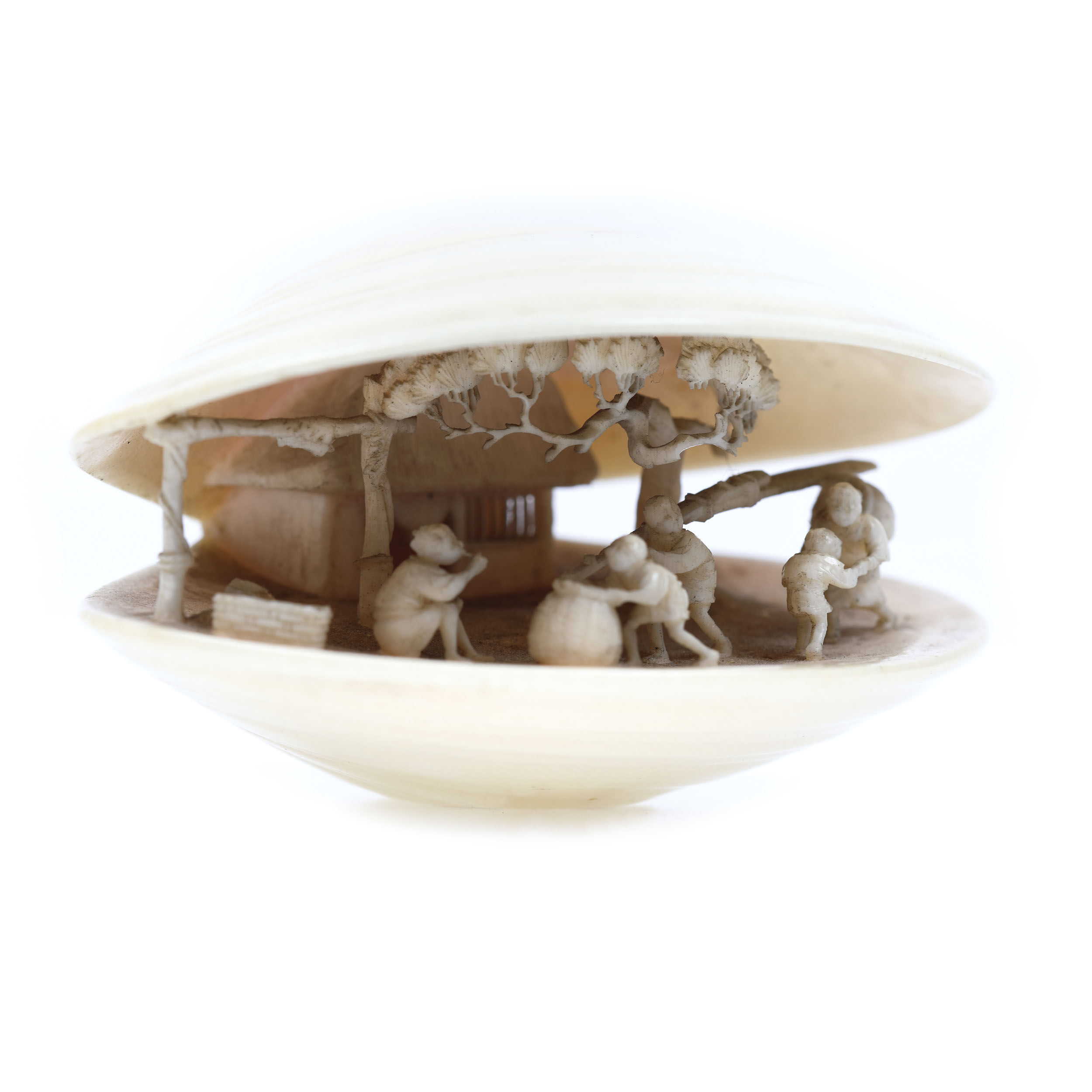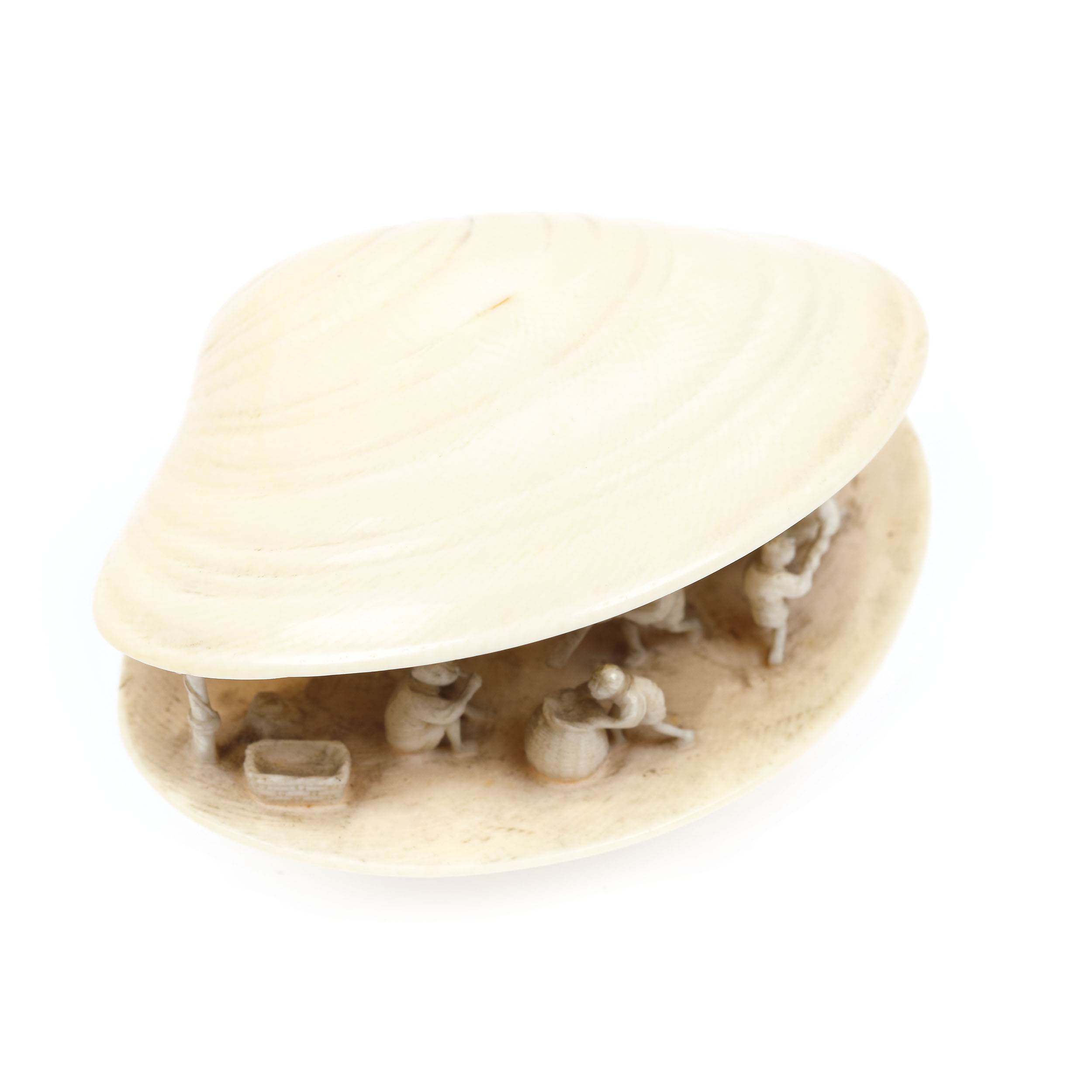 104. Netsuke din fildeș înfățișând o scoică iar în interiorul acesteia o scenă de viață rurală, semnat Gazan, perioada Meiji, Japonia, cca. 1900