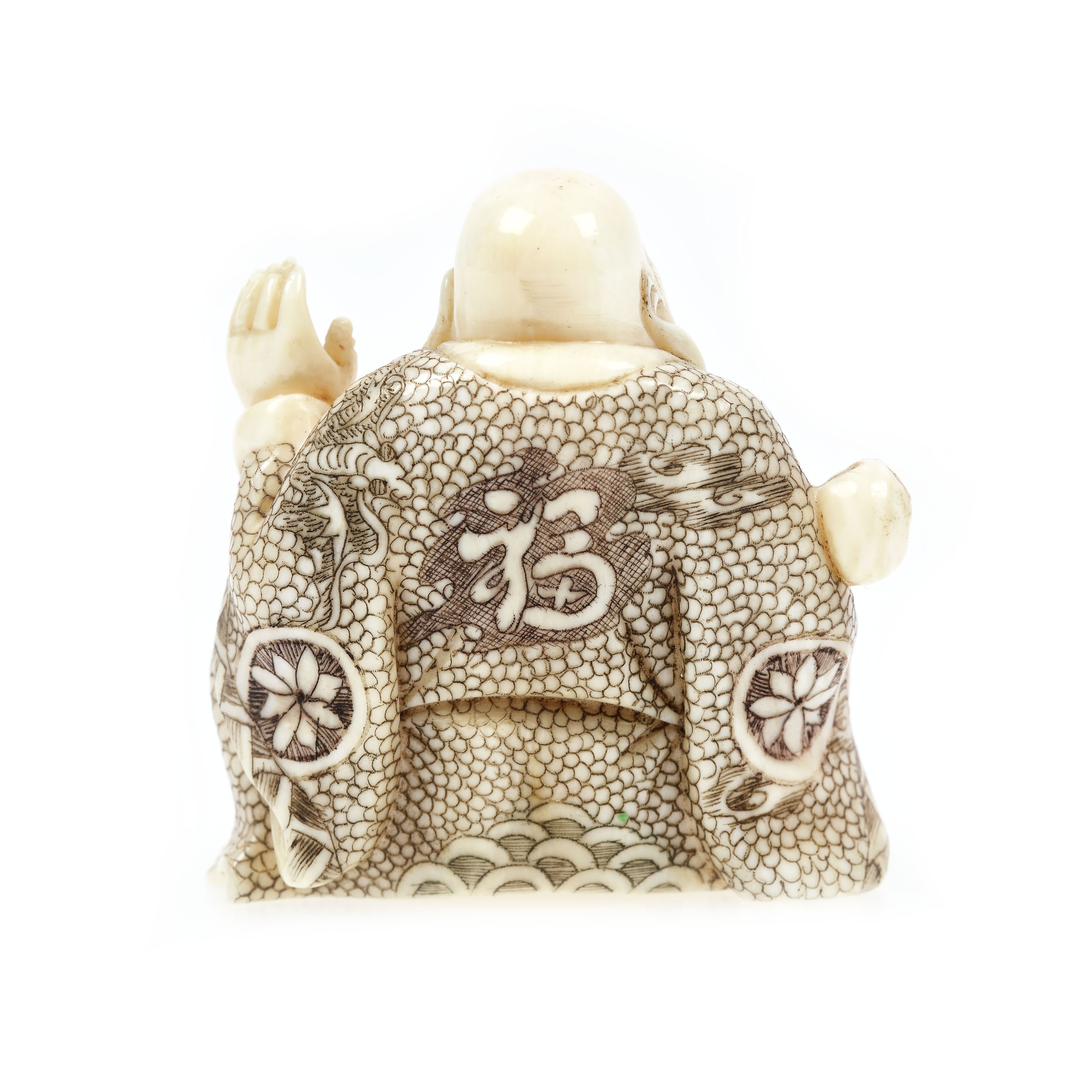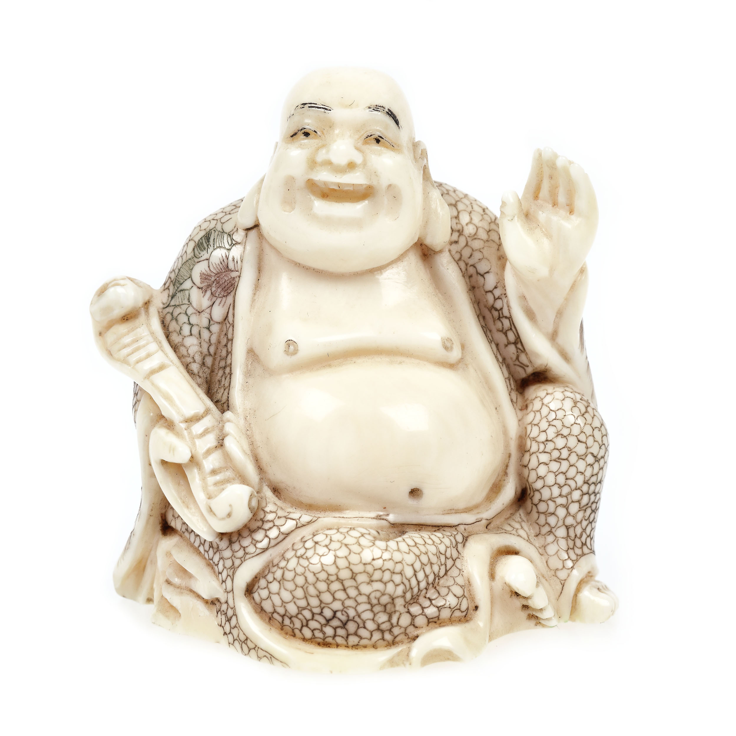 106. Netsuke din fildeș înfățișându-l pe Buddha, semnat Goichi, perioada Meiji, Japonia, sec. XIX