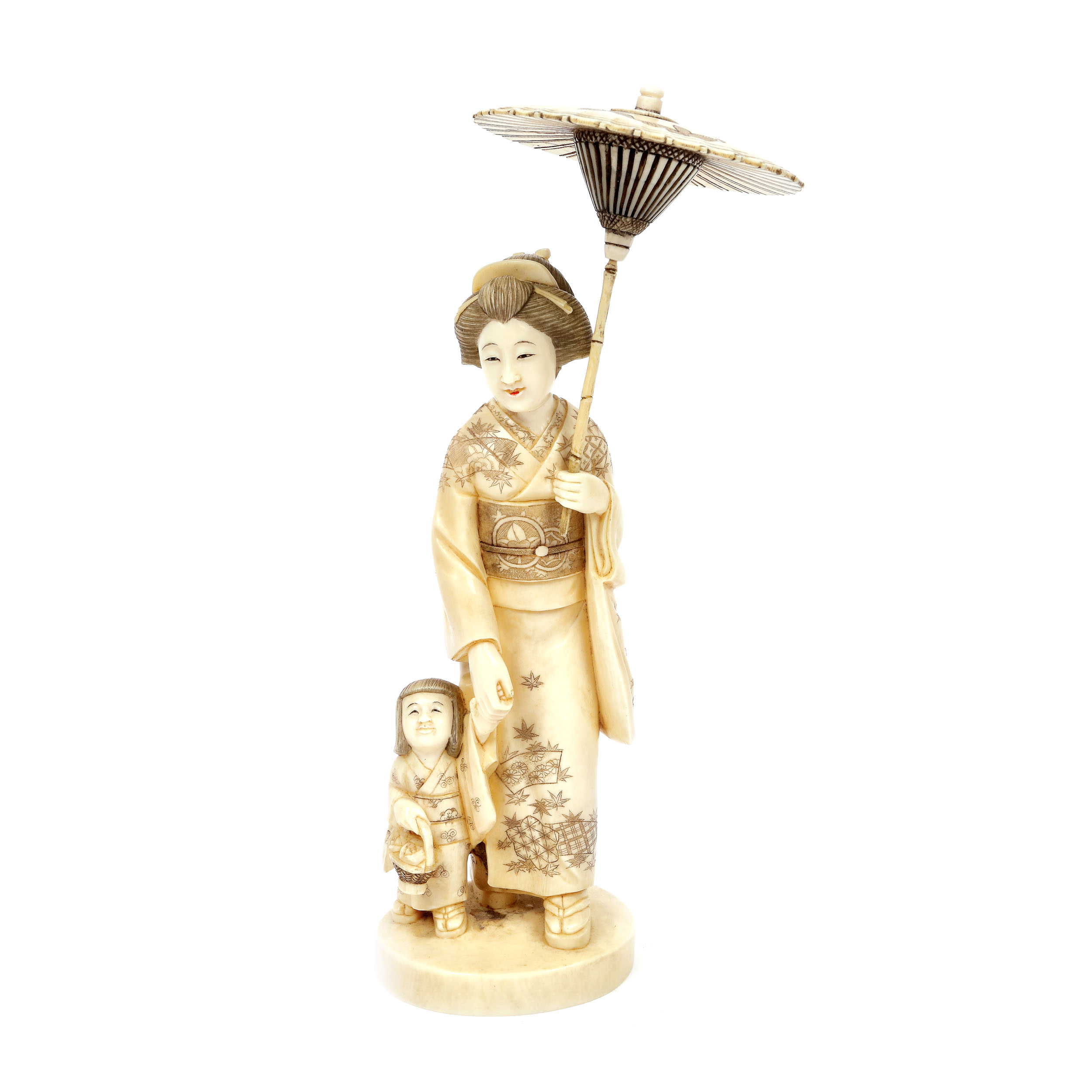 91. Okimono din fildeș înfățișând o frumoasă japoneză cu un copil la plimbare, perioada Meiji, Japonia, sfârșitul sec. XIX