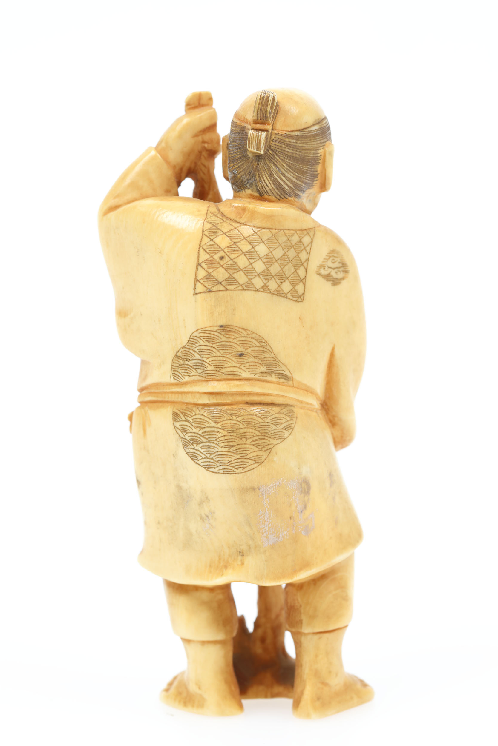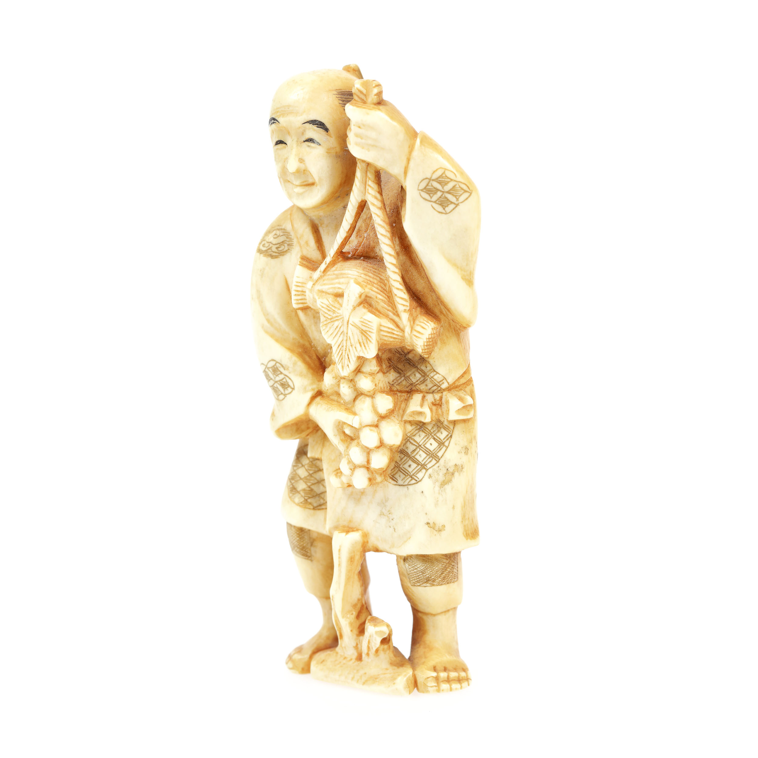 109. Okimono din fildeș înfățișând un bărbat cu un ciorchine de strugure, semnat Yoshiyuki, perioada Meiji, Japonia, sfârșitul sec. XIX