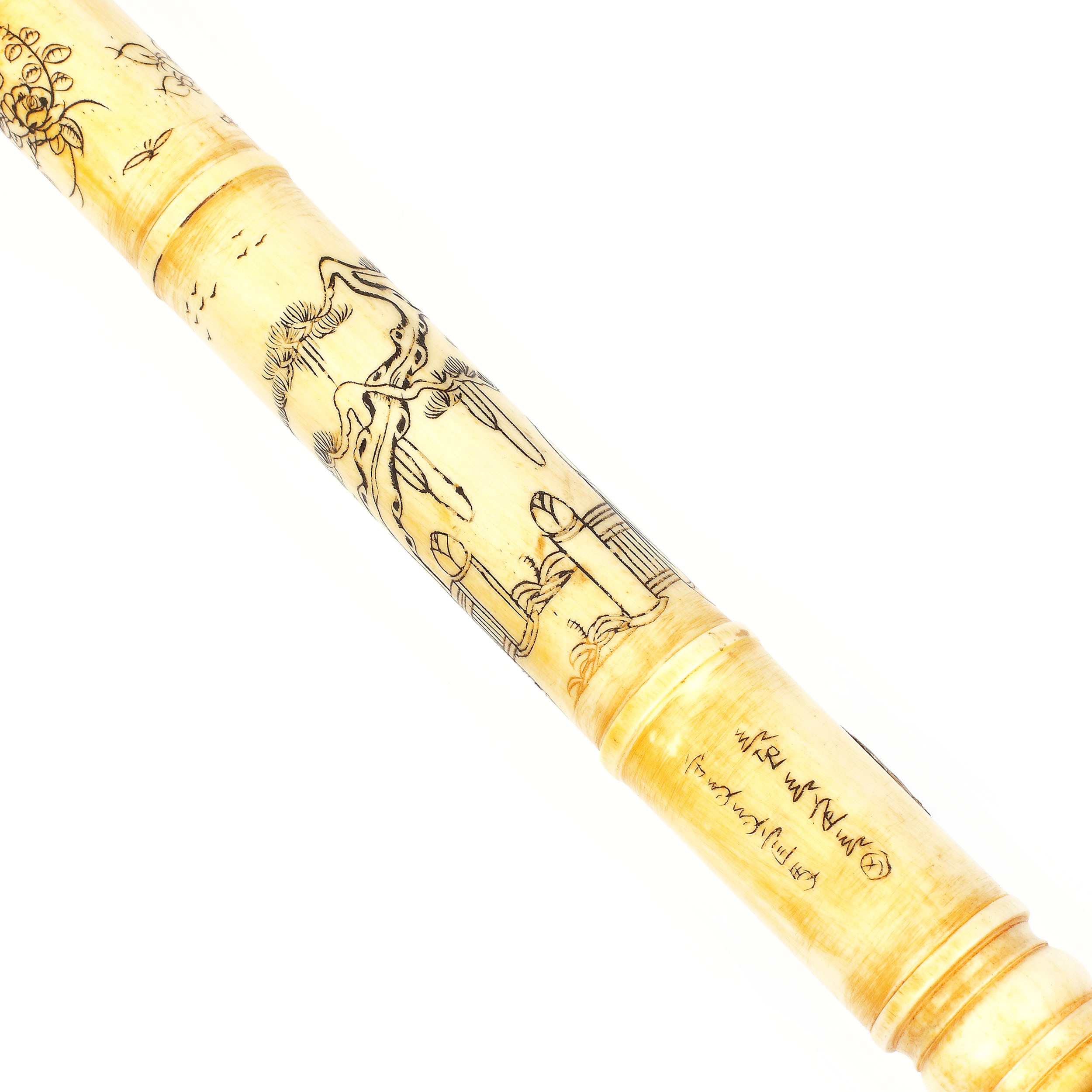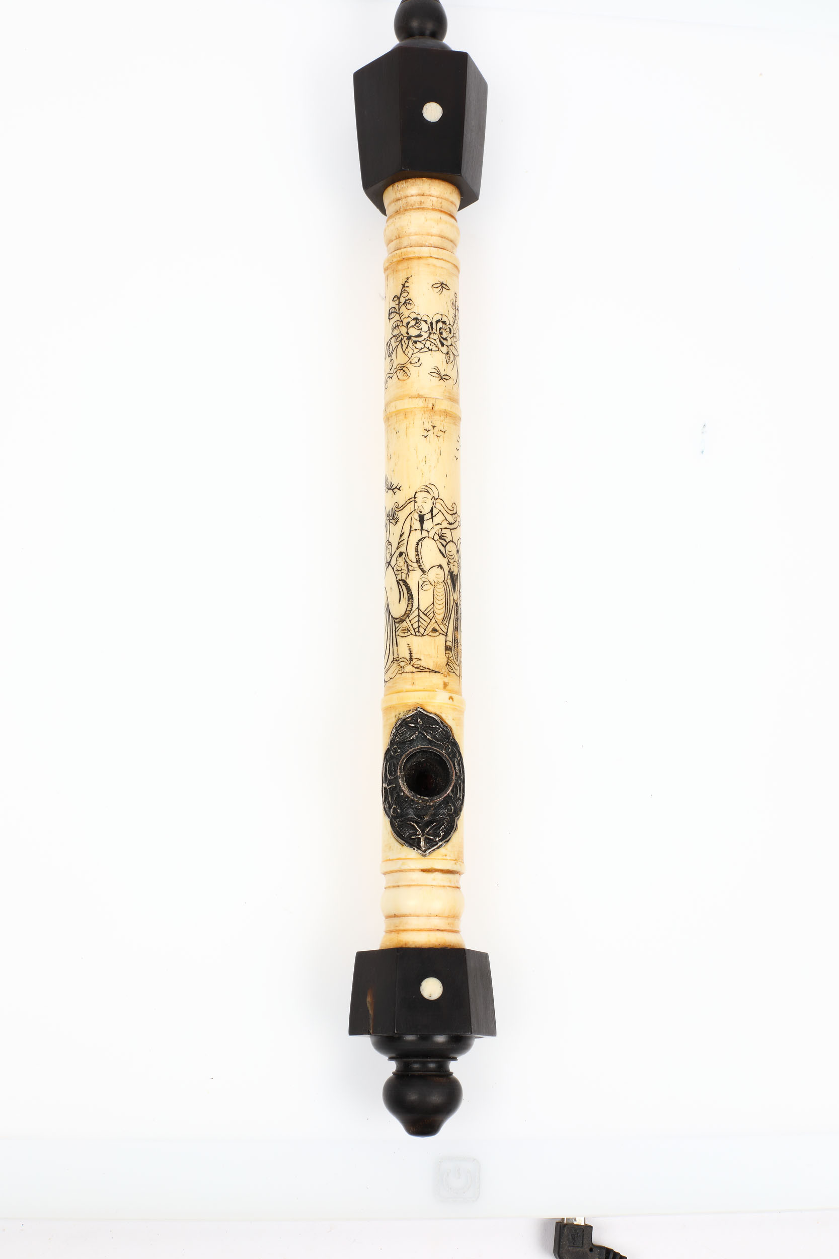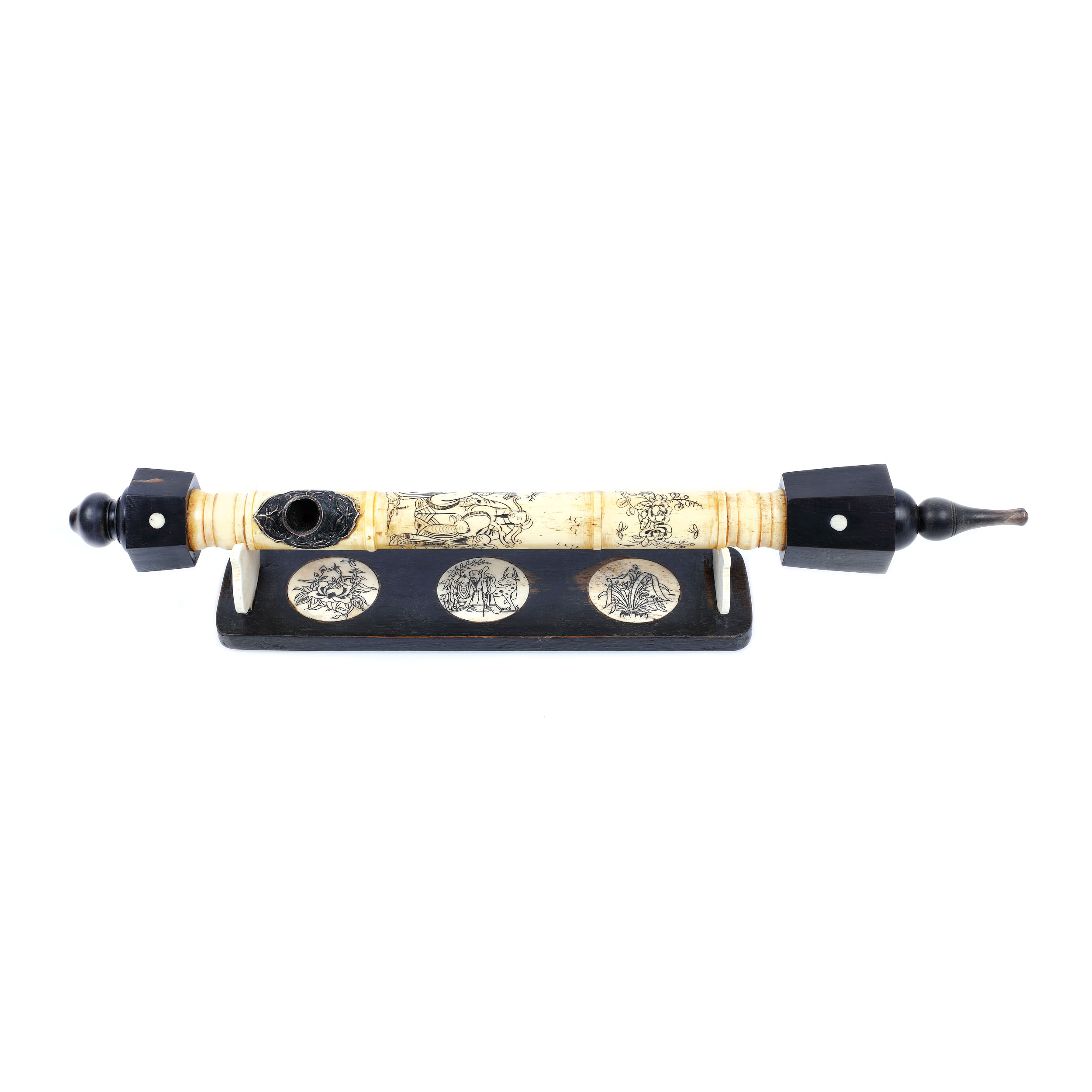 99. Pipă sino-tibetană pentru opiu, din os sculptat, decorată cu motive arhaice, perioada Qing, China, sfârșitul sec. XIX