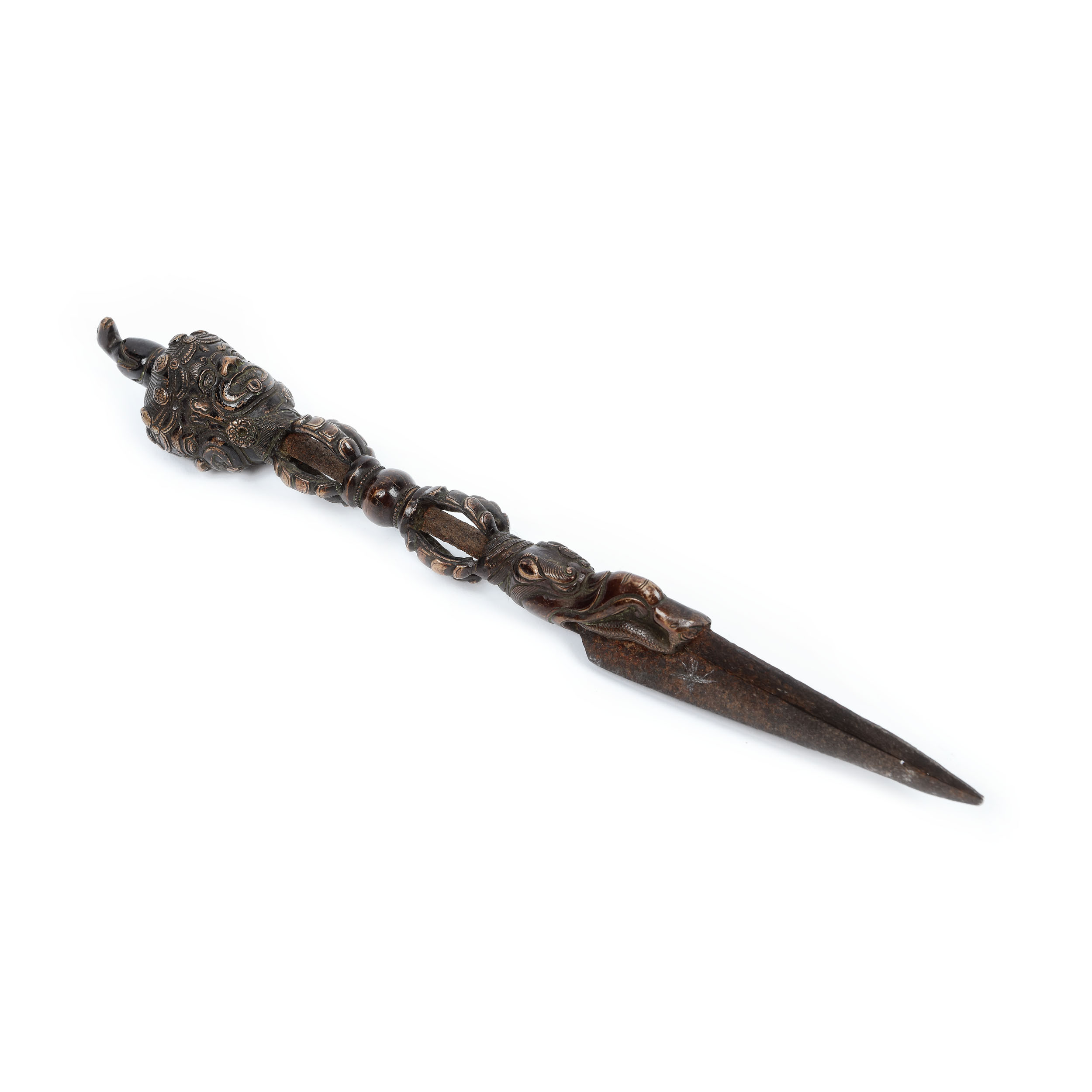 69. Pumnal din bronz, decorat cu motive budiste și vârf tip ”vajra”, Nepal, sec. XVIII