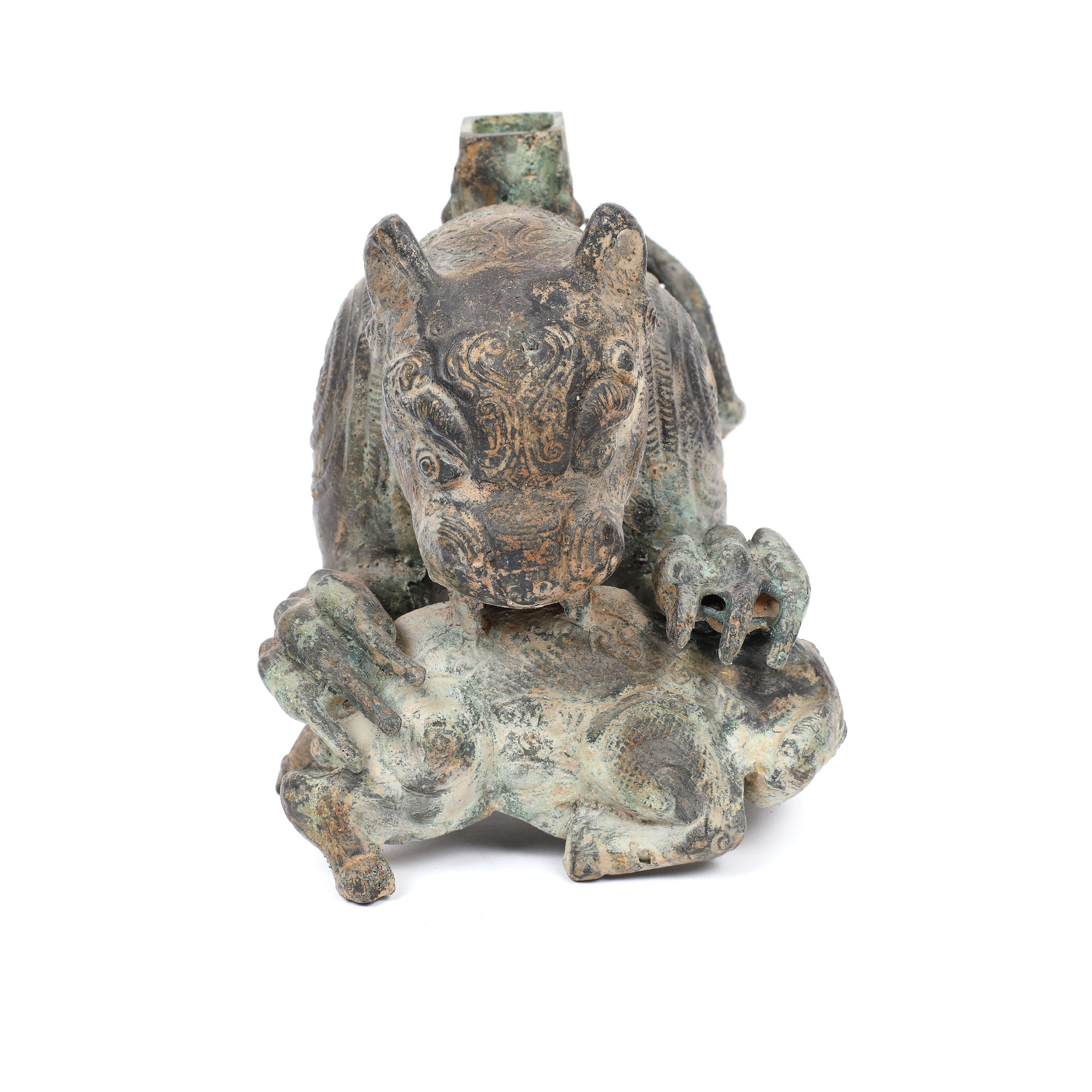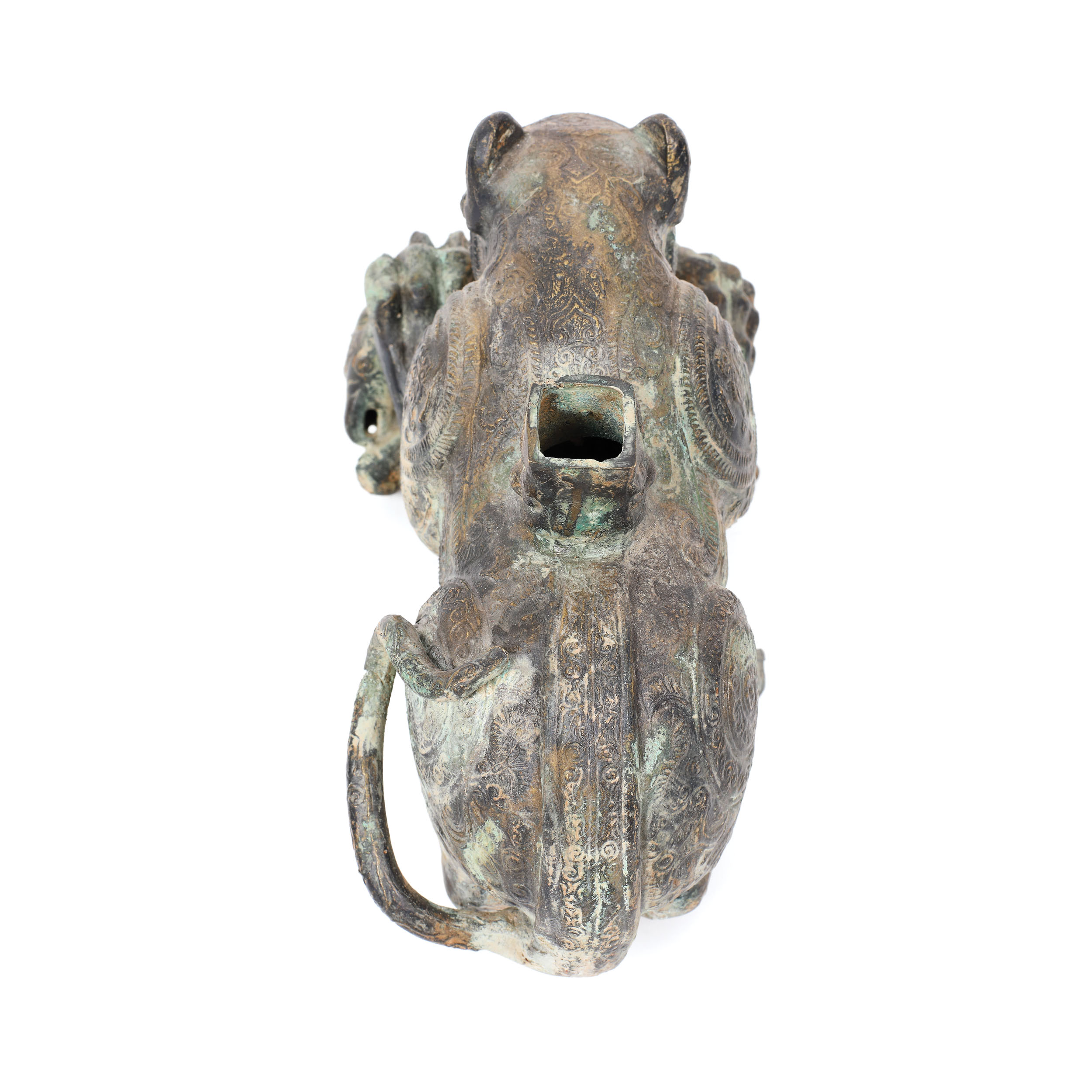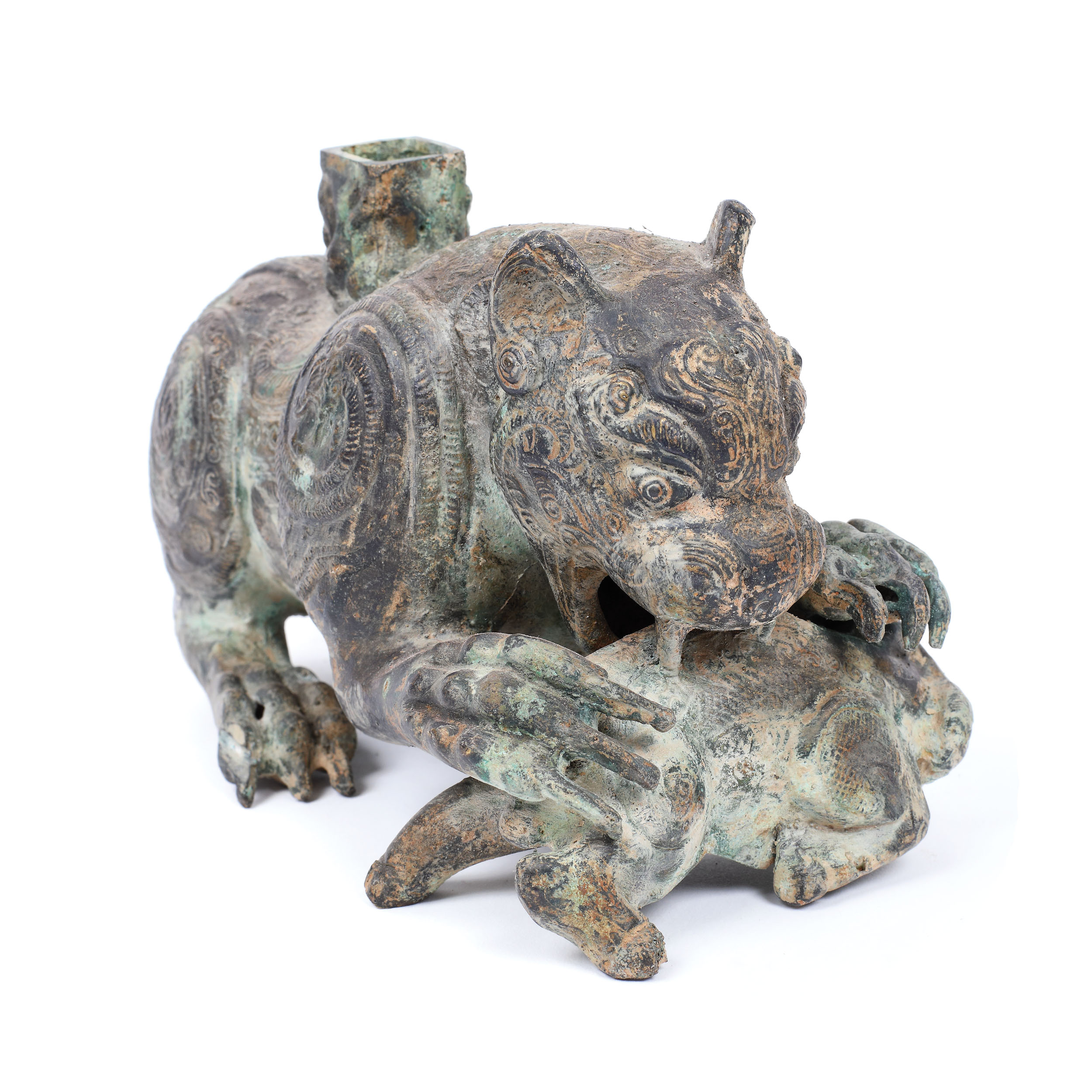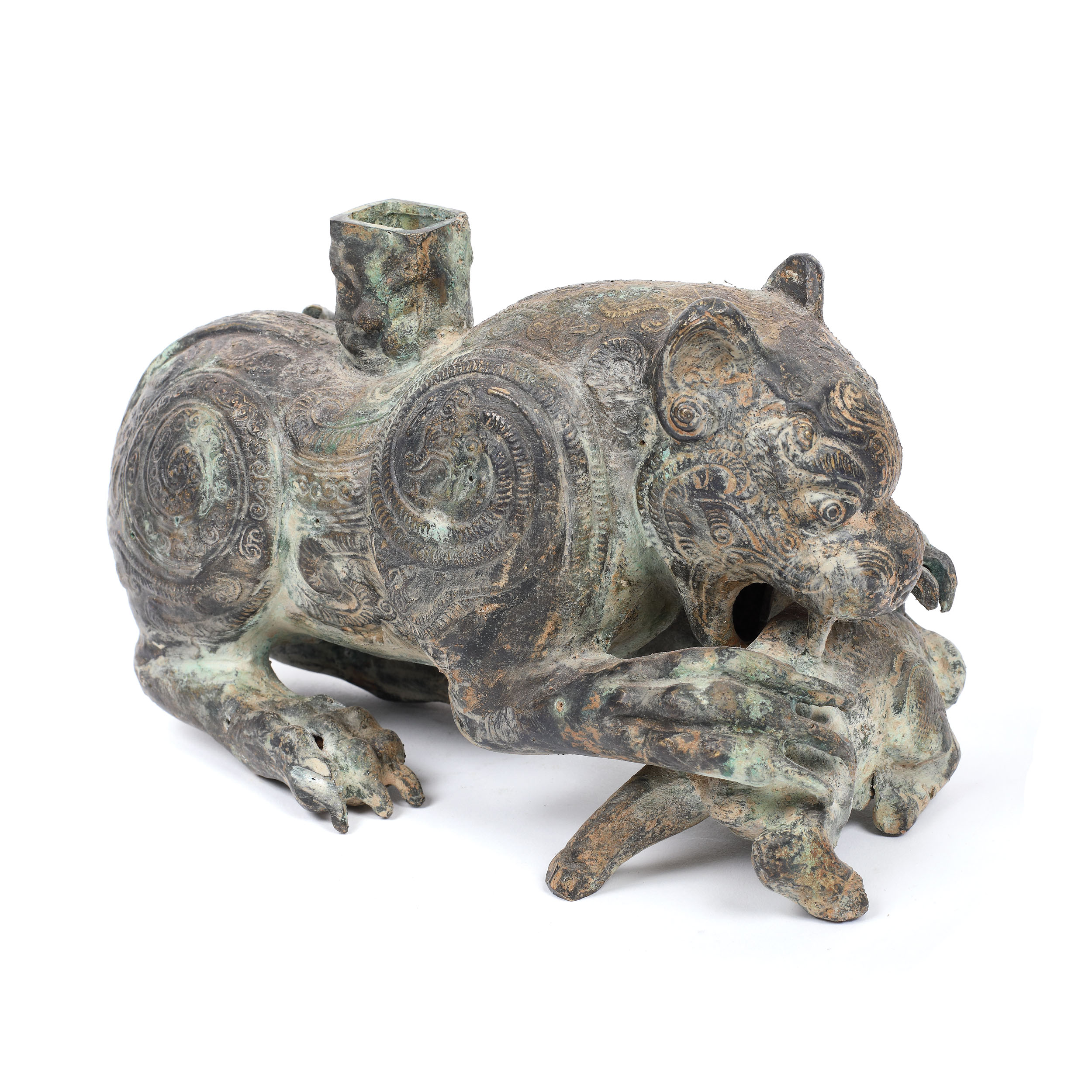 75. Rar brûle-parfum, reprezentând un tigru devorând o căprioară, decorat cu motive arhaice, perioada Statelor Combatante, China, cca. 475–221 î.e.n.
