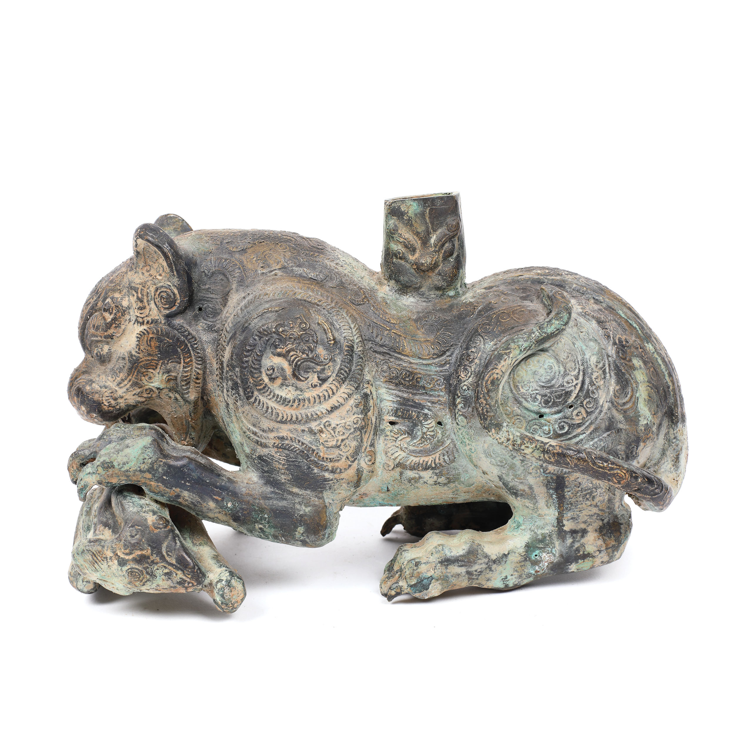 Începând cu anul 500 î.Hr., motivele animaliere au dominat majoritatea tipurilor de artă chineză. Printre cele mai vechi reprezentări ale tigrilor se numără sculpturile din jad alb care datează de cel puțin 4.000 de ani. În secolul al IX-lea î.en, descoperim statuete înfățișând tigrii turnate în bronz, de obicei înfățișate în poziție de atac, cozile lor fiind de obicei stânse lângă corp. Aceste statuete au o înfățișare înfricoșătoare, cu capete mari, gravate cu motive arhaice, ochii bulbucați, dinți ascuțiți, labe și gheare supradimensionate. Acest lot prezintă caneluri adânci pe corp, pentru a imita într-o cheie dramatică dungile tigrului. Similitudinile acestor statuete, descoperite în vestul Chinei, cu obiectele găsite în Munții Altai (sudul Rusiei) sugerează un schimb artistic timpuriu între China și statele învecinate.