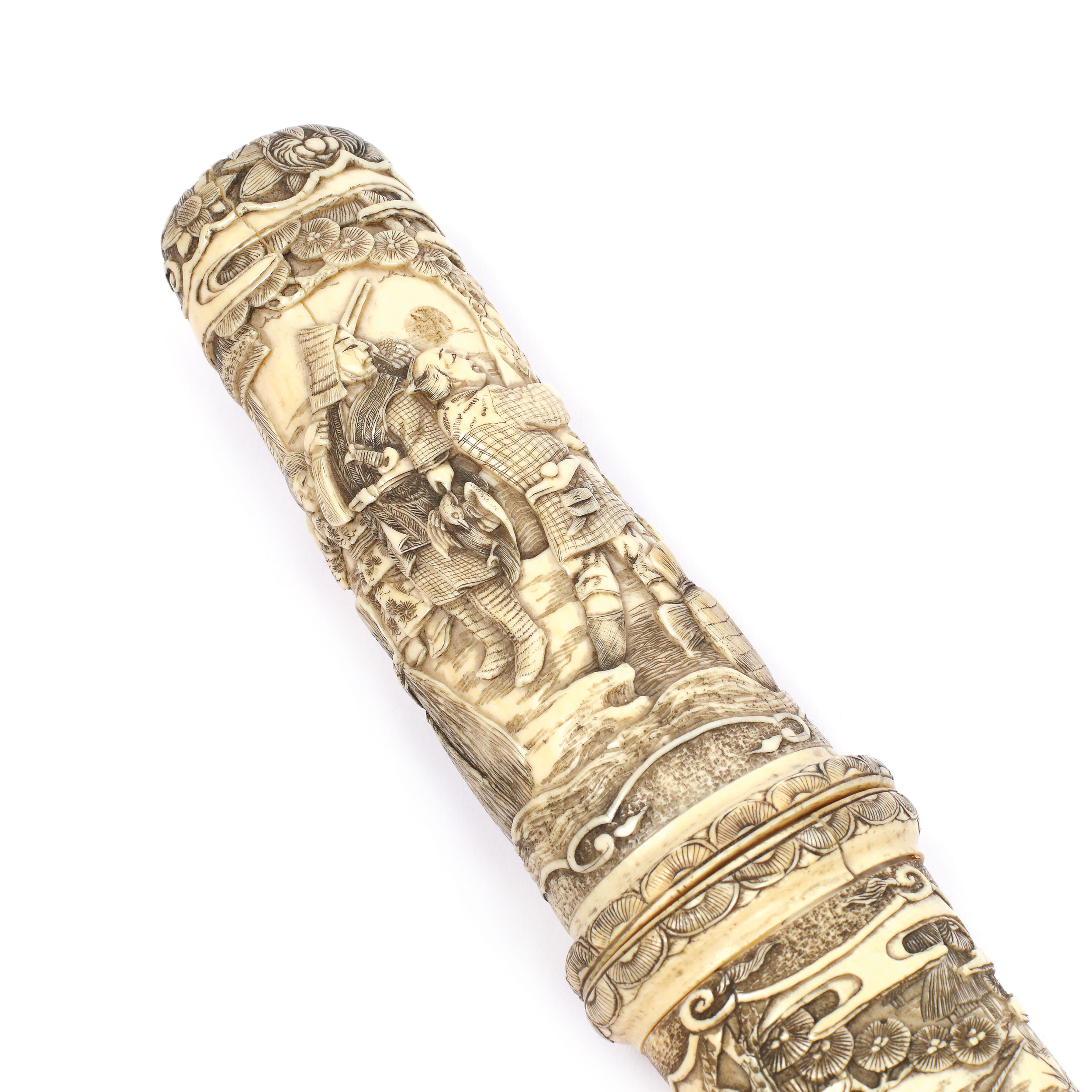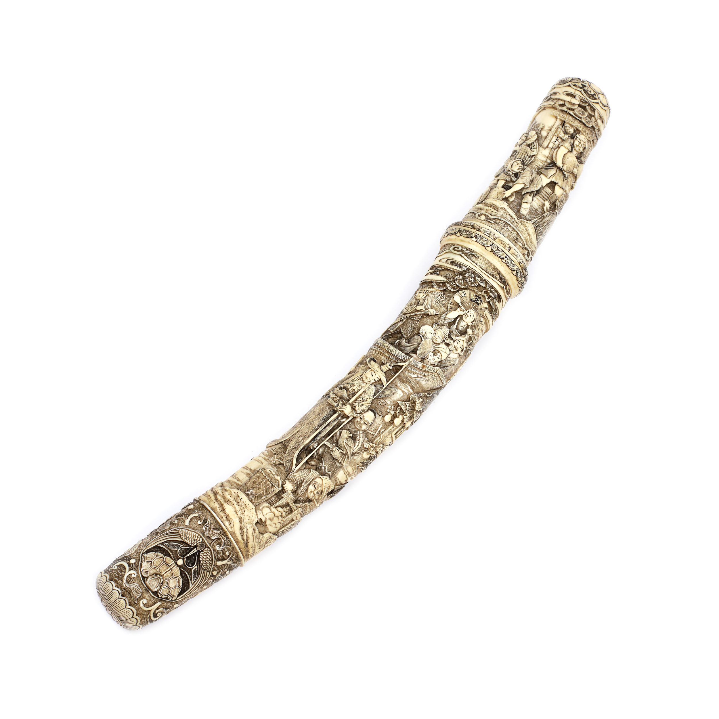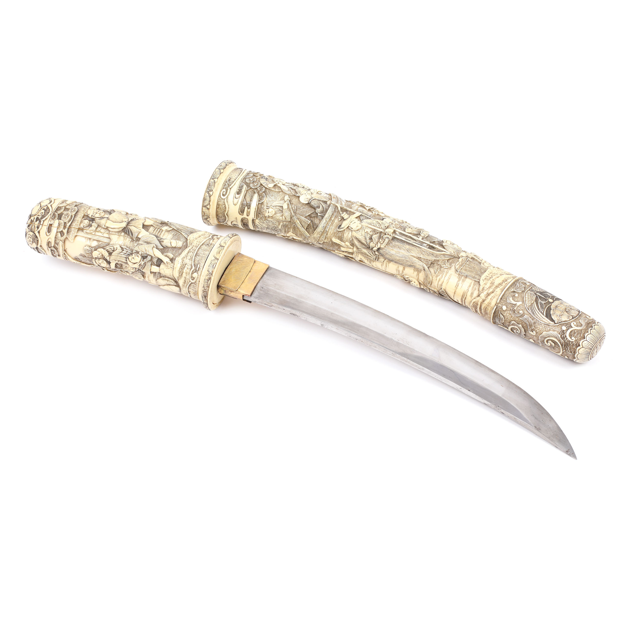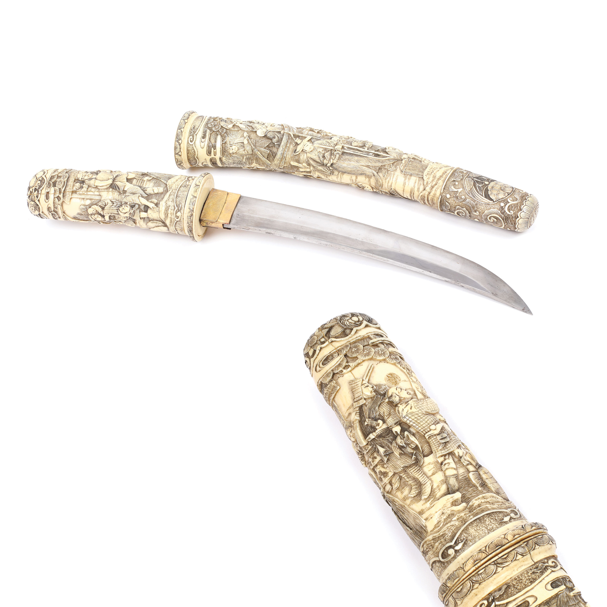 65. Sabie scurtă tip Tanto, realizată și semnată de maestrul Kosai, într-o superbă teacă din os sculptat, decorată cu scene tradiționale, începutul perioadei Meiji, Japonia, cca. 1860-1880
