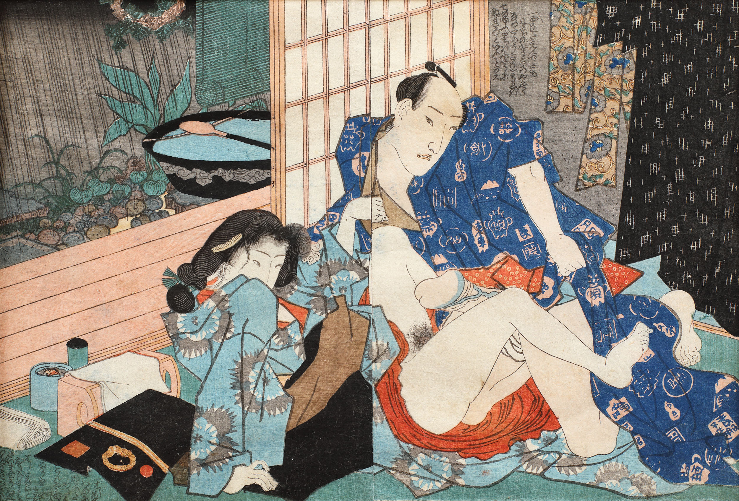 56. Scenă erotică (Shunga), reprezentând un cuplu ferit de furtună într-un cadru domestic [cca. 1840]
