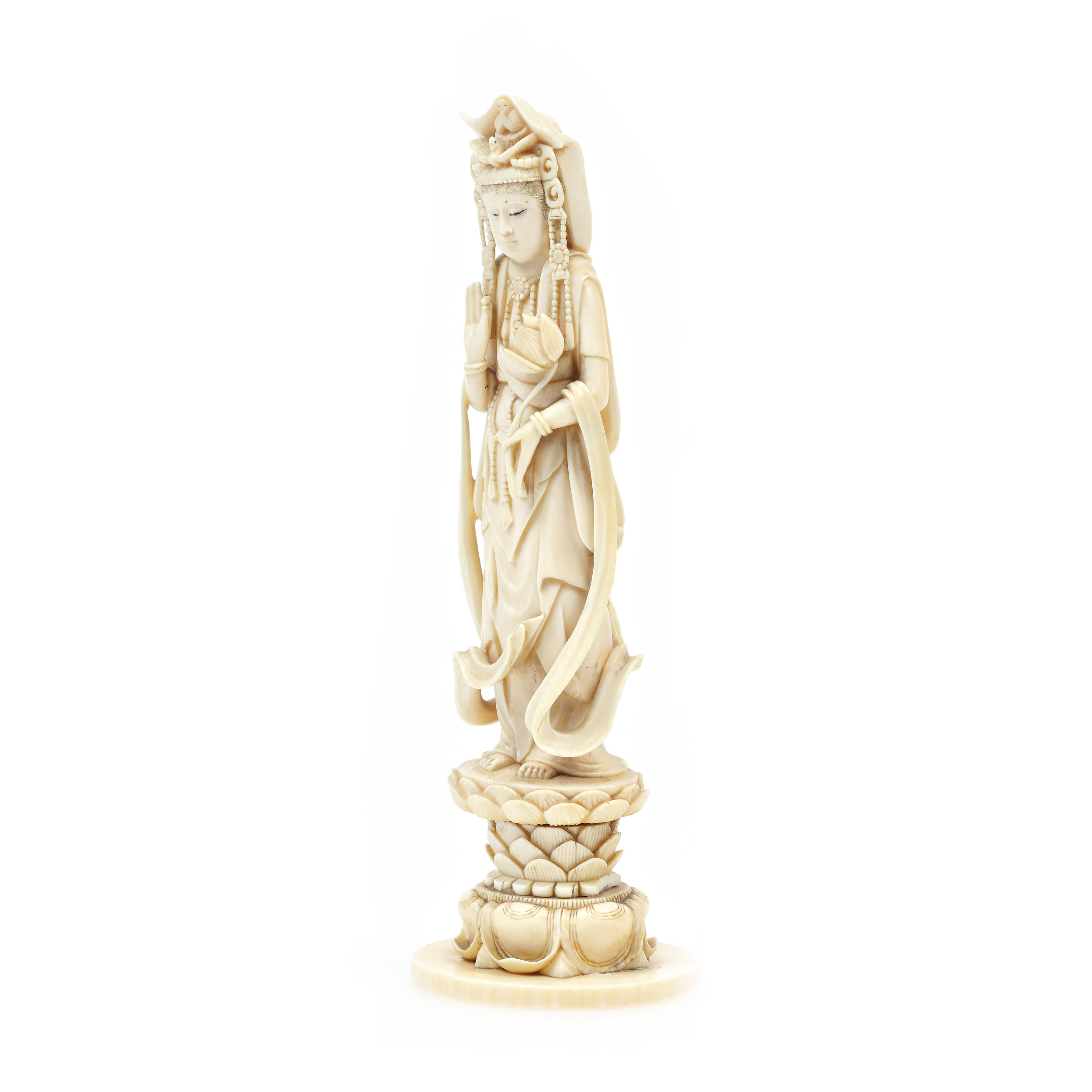 95. Statuetă din fildeș înfățișând-o pe zeitatea buddhista Guan Yin pe o floare de lotus, sfârșitul perioadei Qing, China, prima jumătate a sec. XX