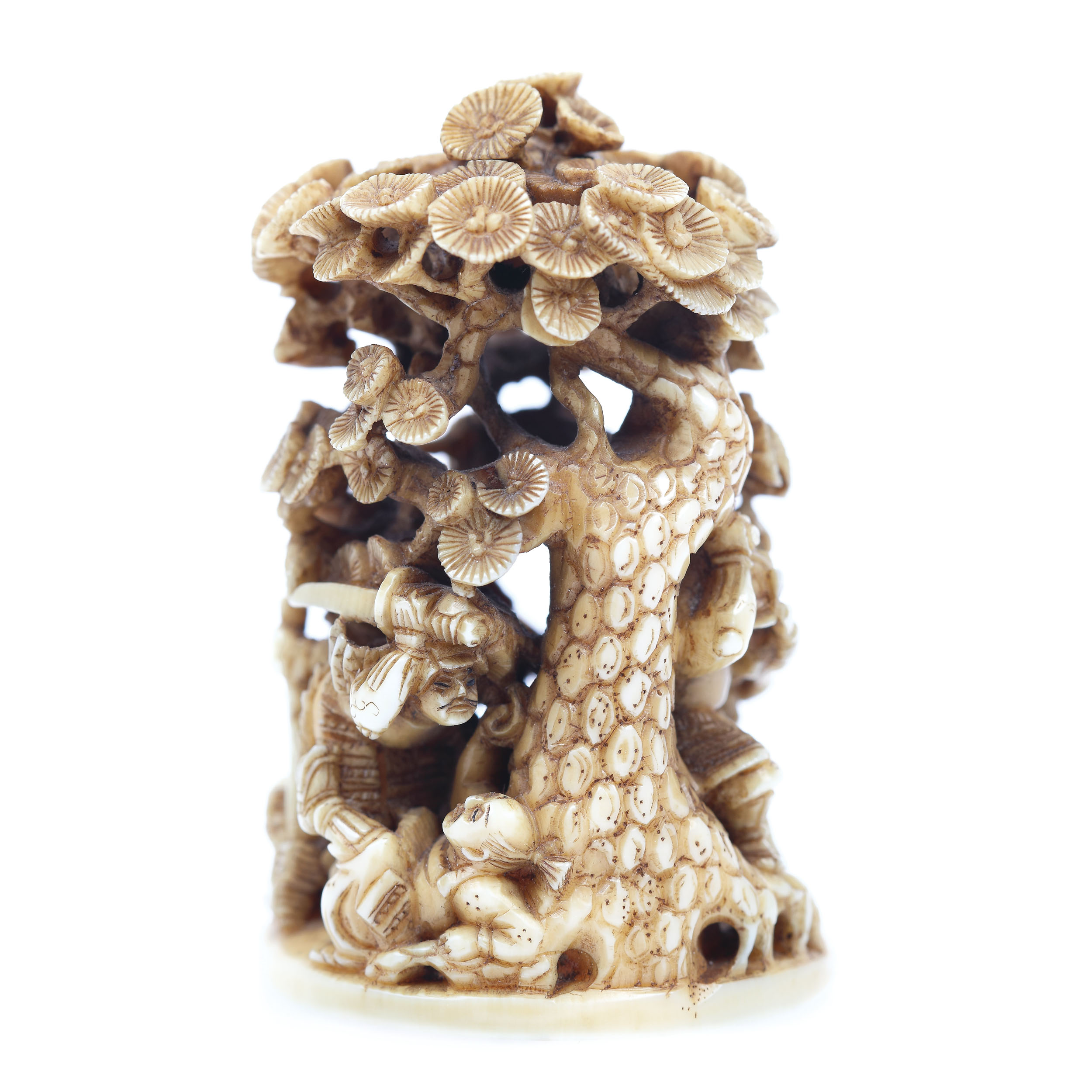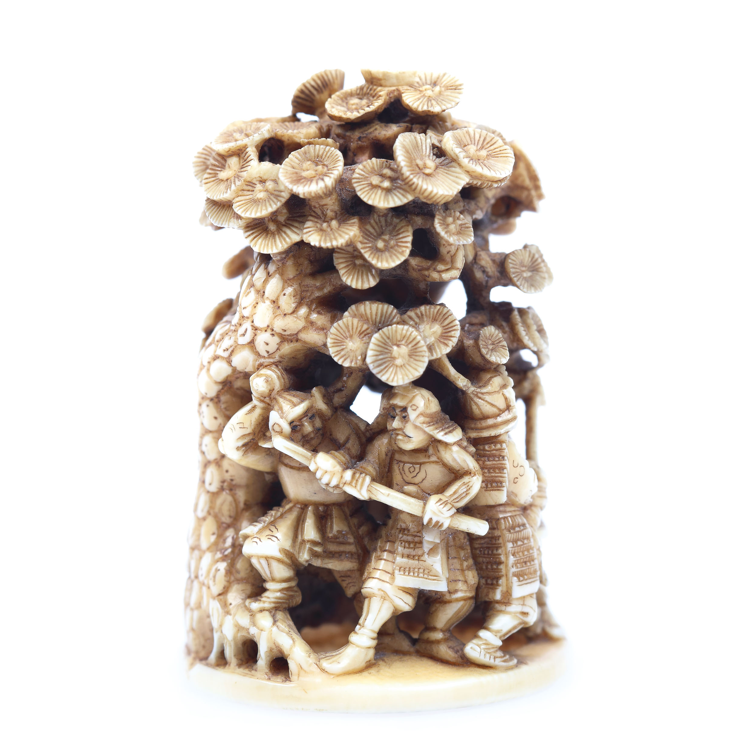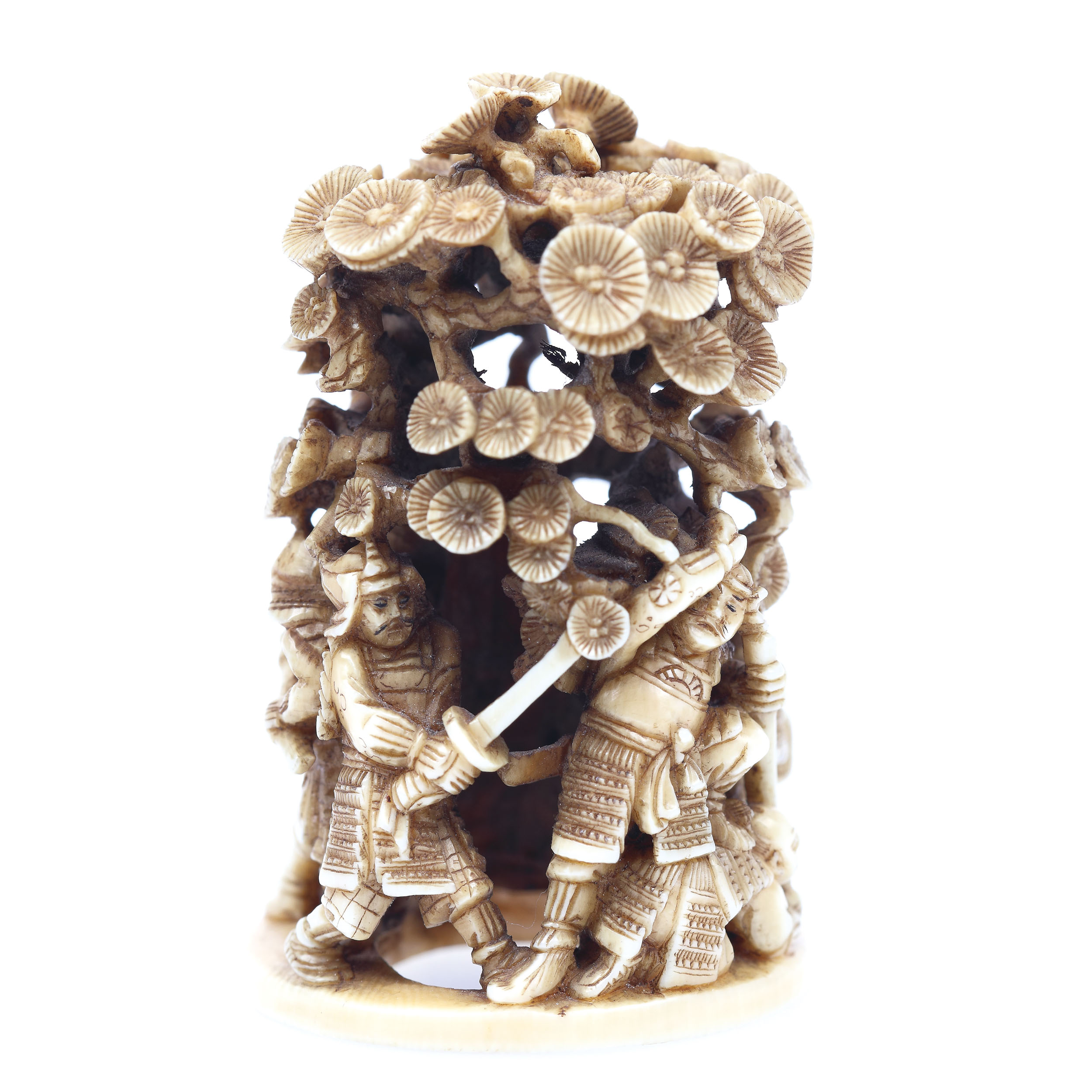 86. Statuetă din fildeș înfățișând o scenă de luptă, semnată Bunju, perioada Meiji, Japonia, sec. XIX