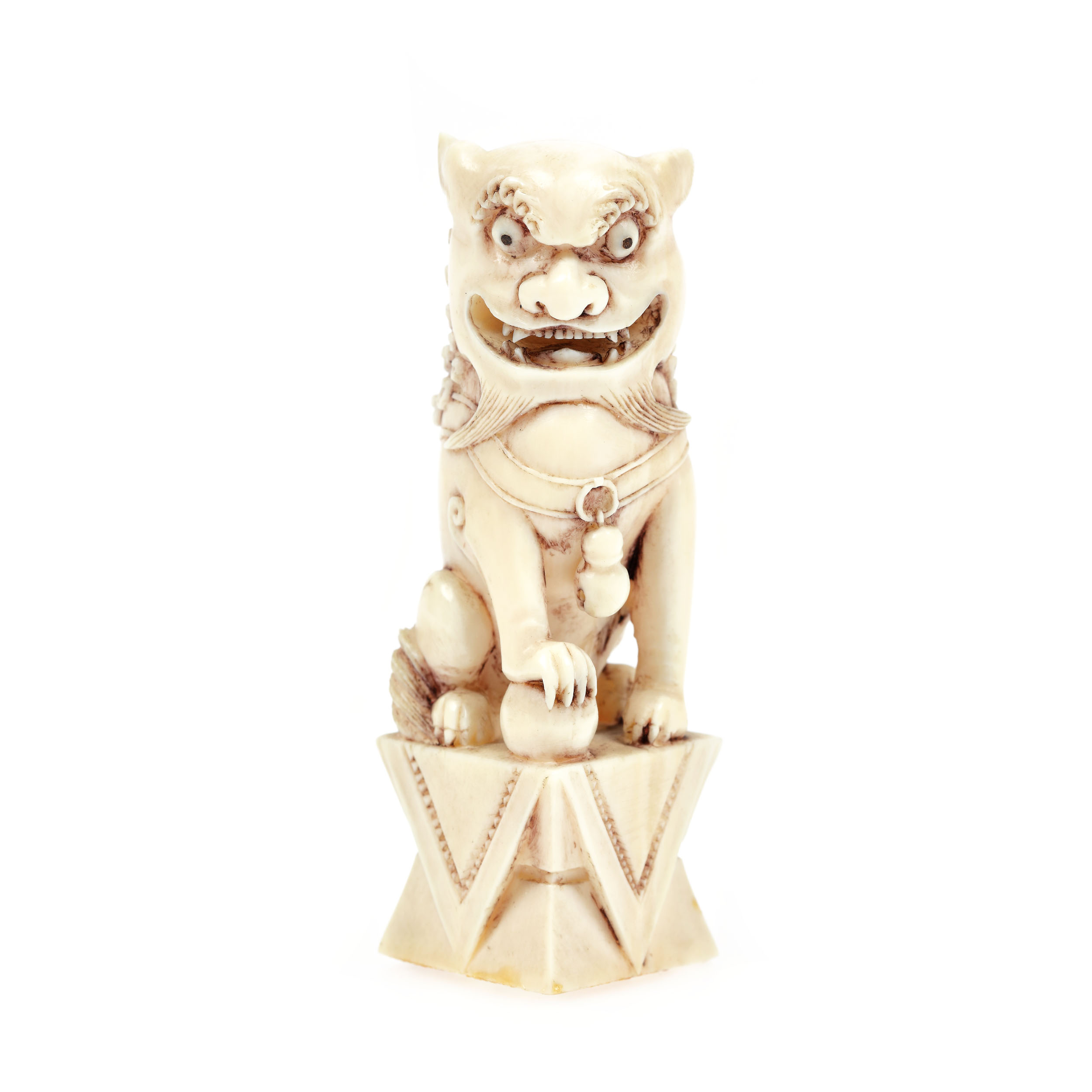 85. Statuetă din fildeș reprezentând un câine Foo, sfârșitul perioadei Qing, China, prima jumătate a sec. XX