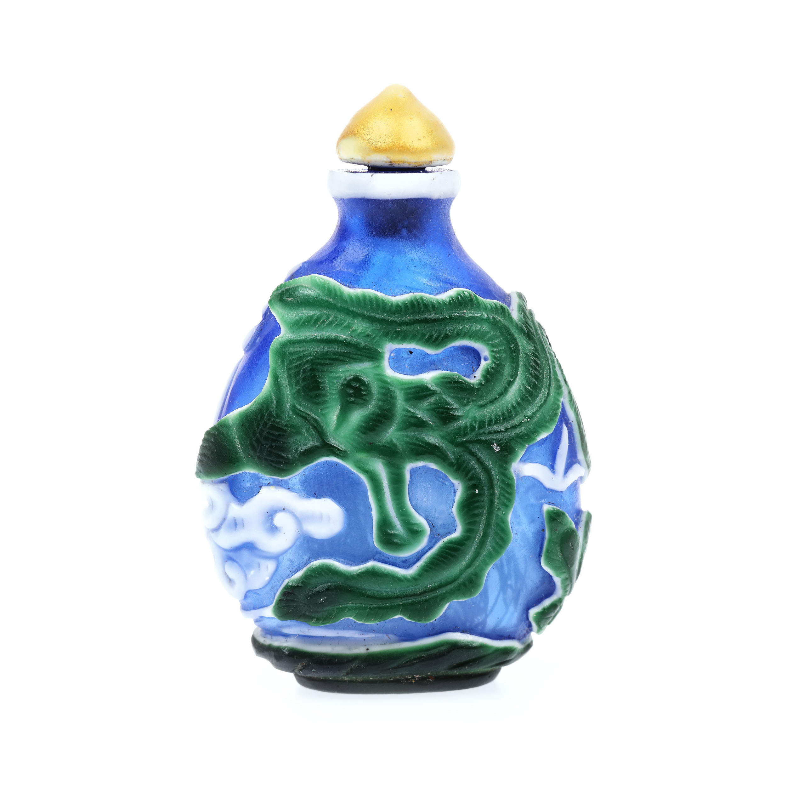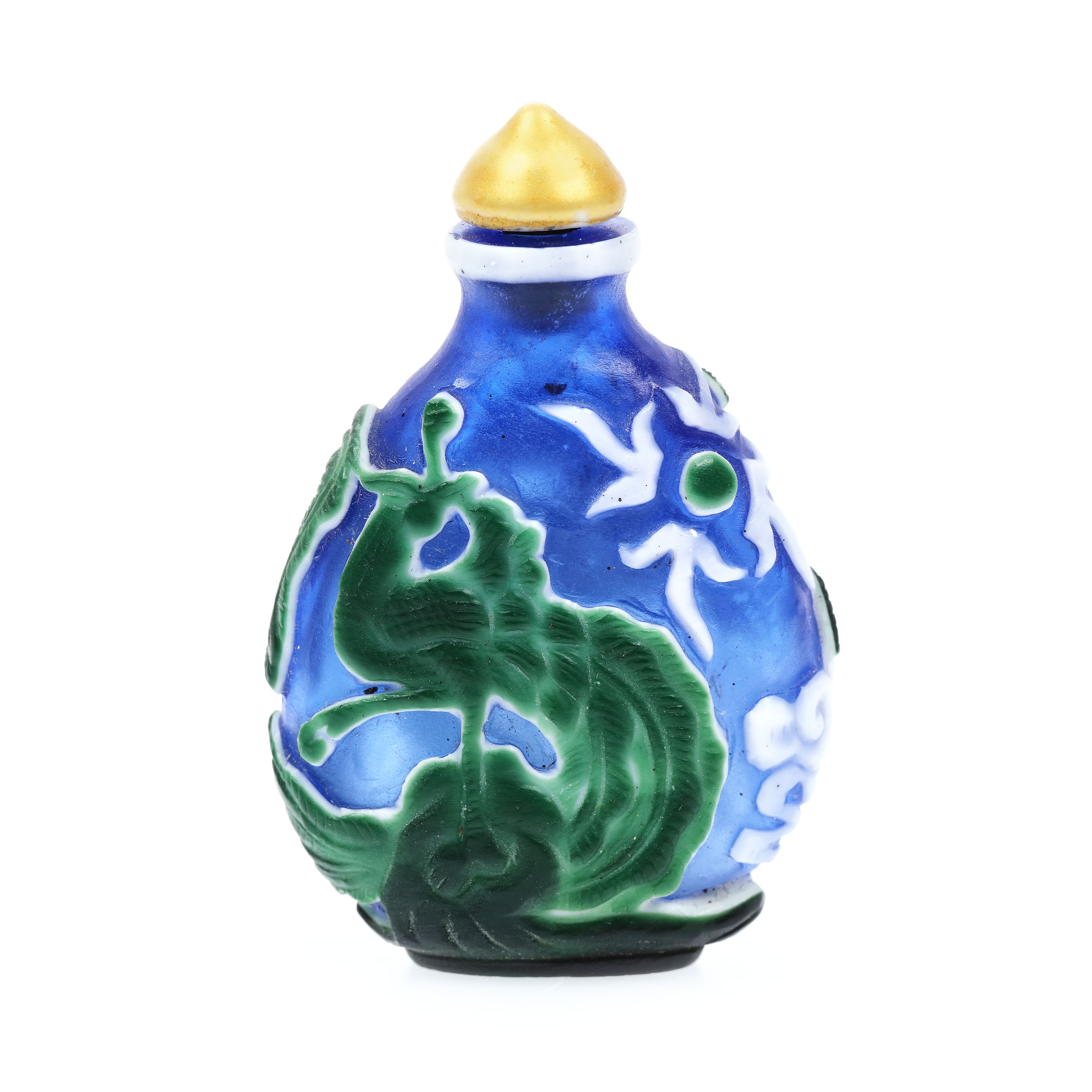 113. Sticluță pentru prizat, din sticlă stratificată în trei culori, decorată cu motivul păsării Phoenix, sfârșitul perioadei Qing, China, începutul sec. XX