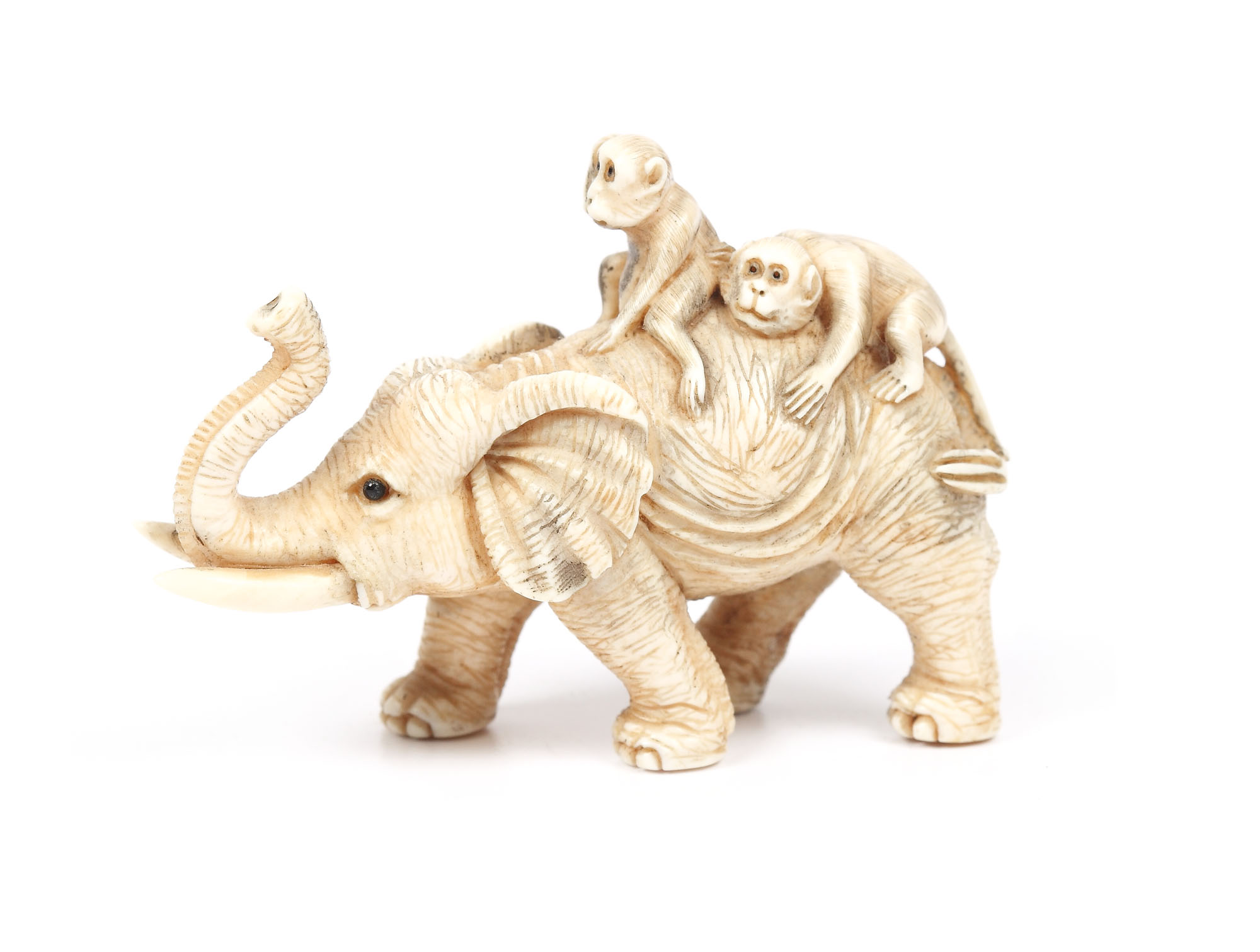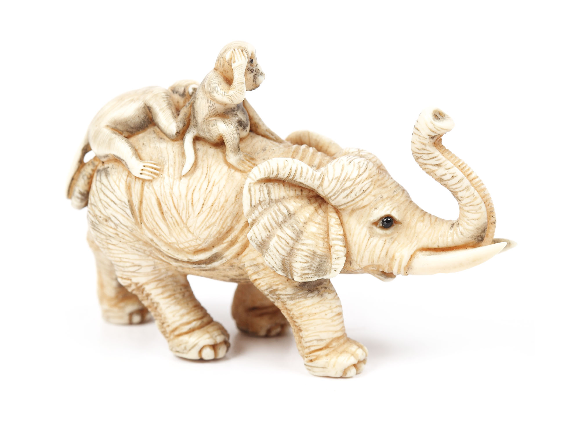 47. Netsuke din fildeş reprezentând două maimuţe călărind un elefant, semnat de sculptor japonez de perioadă Edo