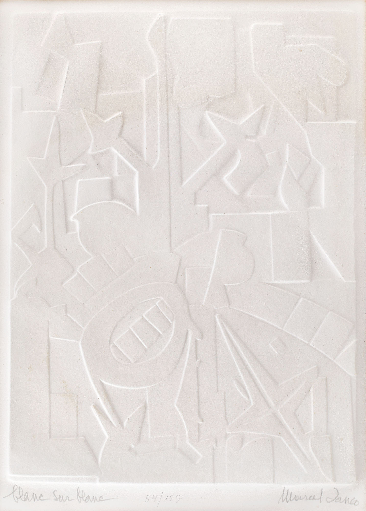 semnat dreapta jos, în creion, "Marcel Ianco"; numerotat central jos, în creion, "54/150"; intitulat stânga jos, în creion, "Blanc sur blanc"