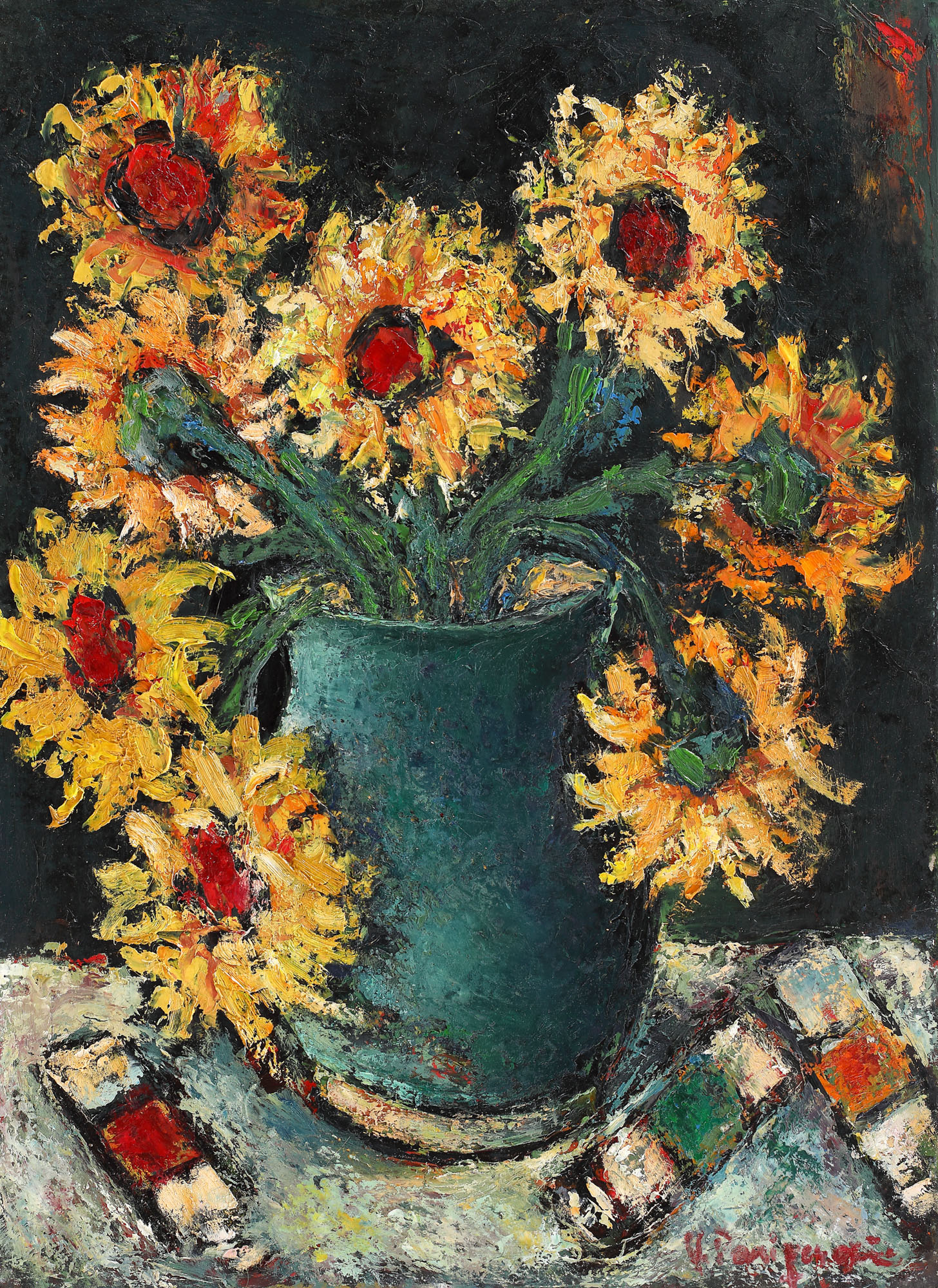 semnat dreapta jos, cu roșu, "V. Parizescu"; notat pe verso, cu roșu, "Natură moartă cu floarea-soarelui este un subiect care îmi place, floarea-soarelui atât de celestă (solară) te încântă mereu. Este atât de strălucitoare pe câmp și mă îmbie să o pictez mereu. O variantă cu floarea soarelui se află într-o colecție mare din Cipru. aprilie-mai 1998, V. Parizescu"