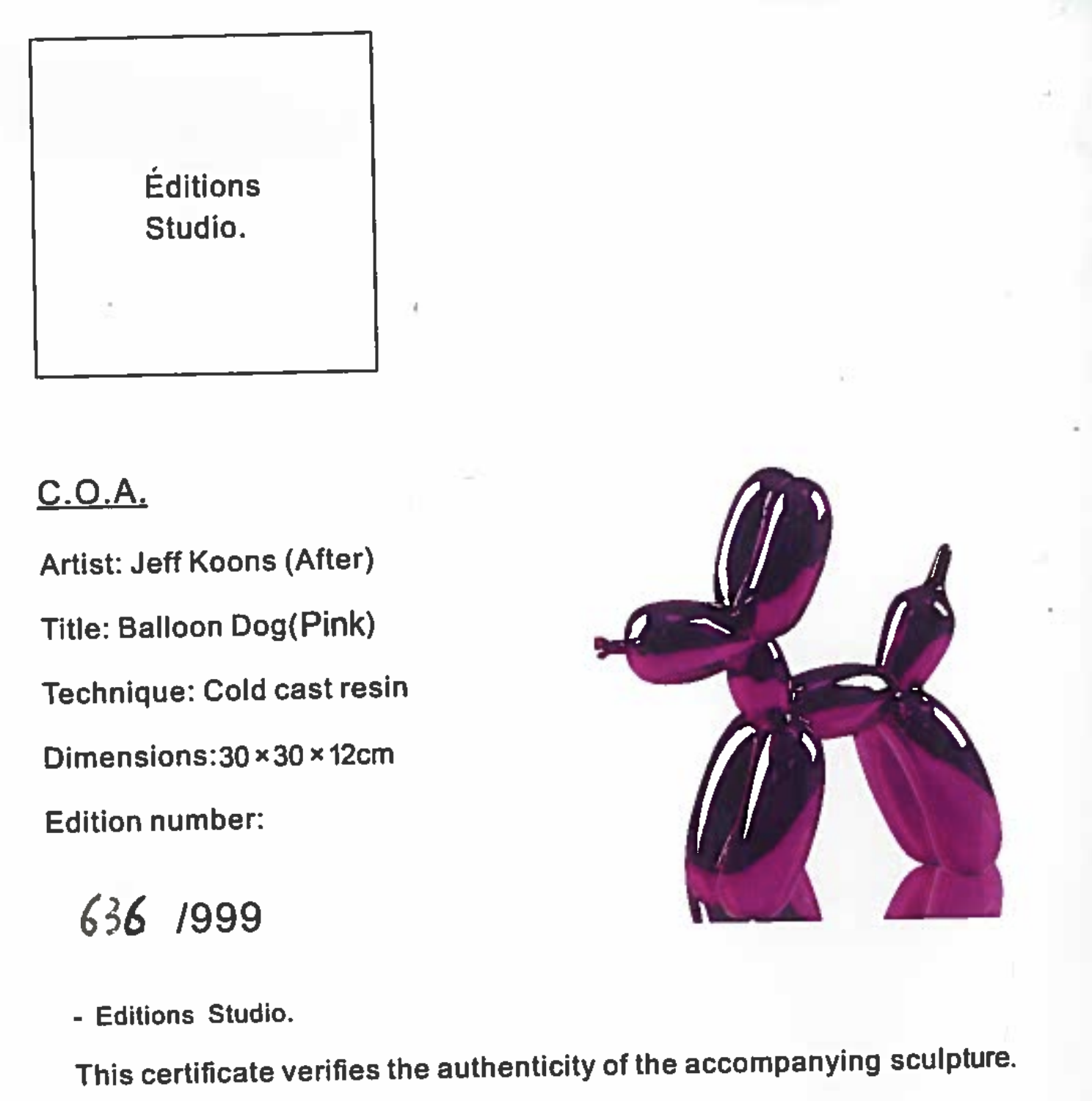 Editions Studio, ex. 636/999, însoțit de cutia originală și certificat de autenticitate emis de Editions Studio; numărul 636 inscripționat la baza lucrării