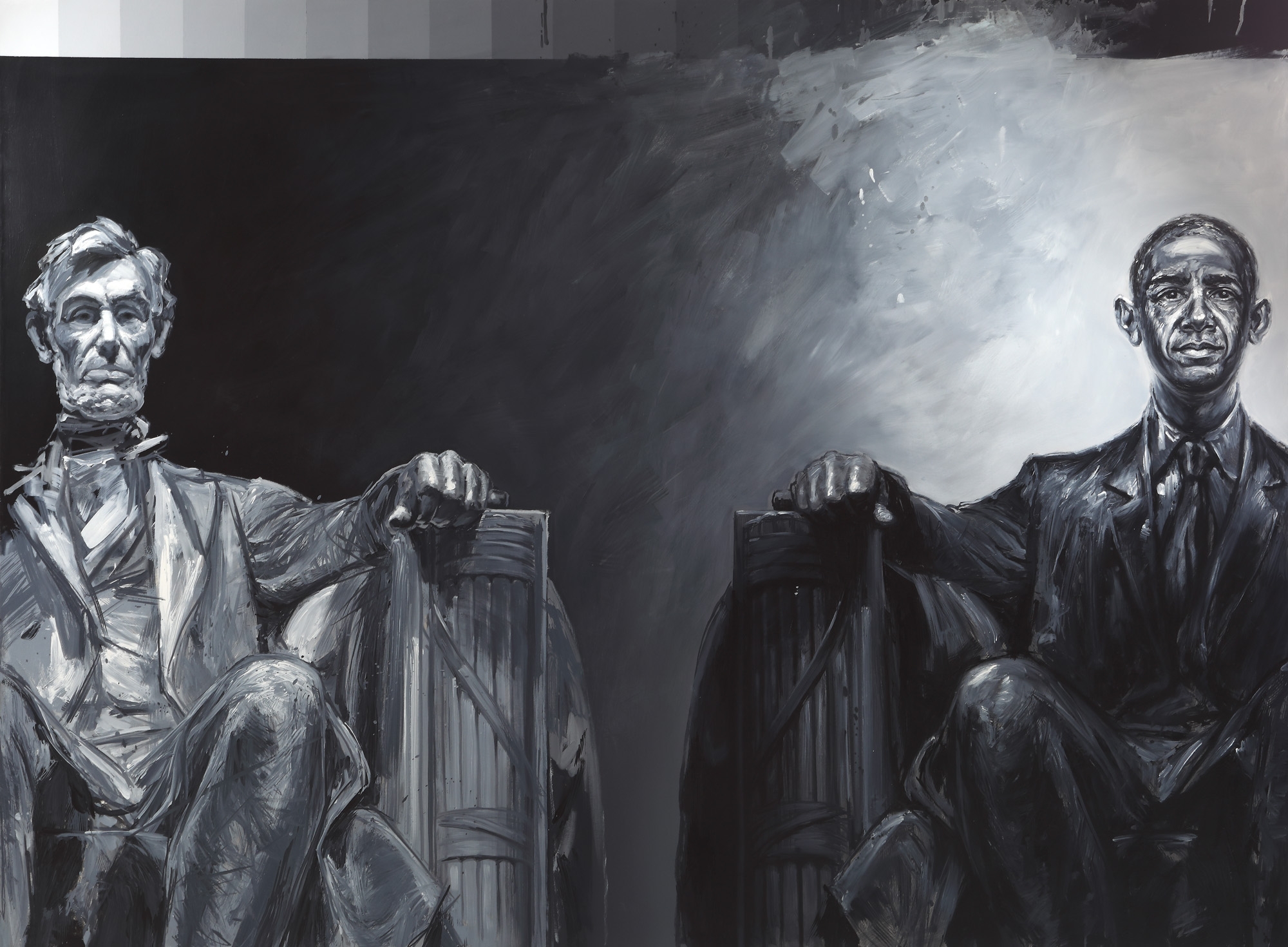 Alegerea unui președinte de culoare în fruntea celui mai puternic stat al lumii a fost percepută ca o victorie a democrației și a libertății de exprimare. Titlul expoziției inițiale din care a făcut parte lucrarea, "44", corespunde numărului de ordine revenit lui Obama în calitate de președinte american. Derutat de o uşoară confuzie a preşedintelui Curţii Supreme de Justiţie, Barack Obama a avut o ezitare fulgurantă la rostirea jurământului în momentul învestirii sale ca preşedinte al Americii şi, astfel, ceremonia a trebuit să fie reluată a doua zi, într-un cadru restrâns, cu mâna stângă pe aceeași Biblie folosită de Abraham Lincoln la învestitura sa din 1861. "Morfingul alb-negru GRADIENT juxtapune „în oglindă” cunoscuta statuie de marmură a lui Abraham Lincoln (realizată de Chester French pentru Memorialul Lincoln din Washington) cu o statuie imaginară din bronz a lui Barack Obama. Asocierea este o trimitere directă la filiaţia dintre ideologiile politice şi proiectele reformatoare ale celor doi preşedinţi americani." ( Valeriu Mladin)