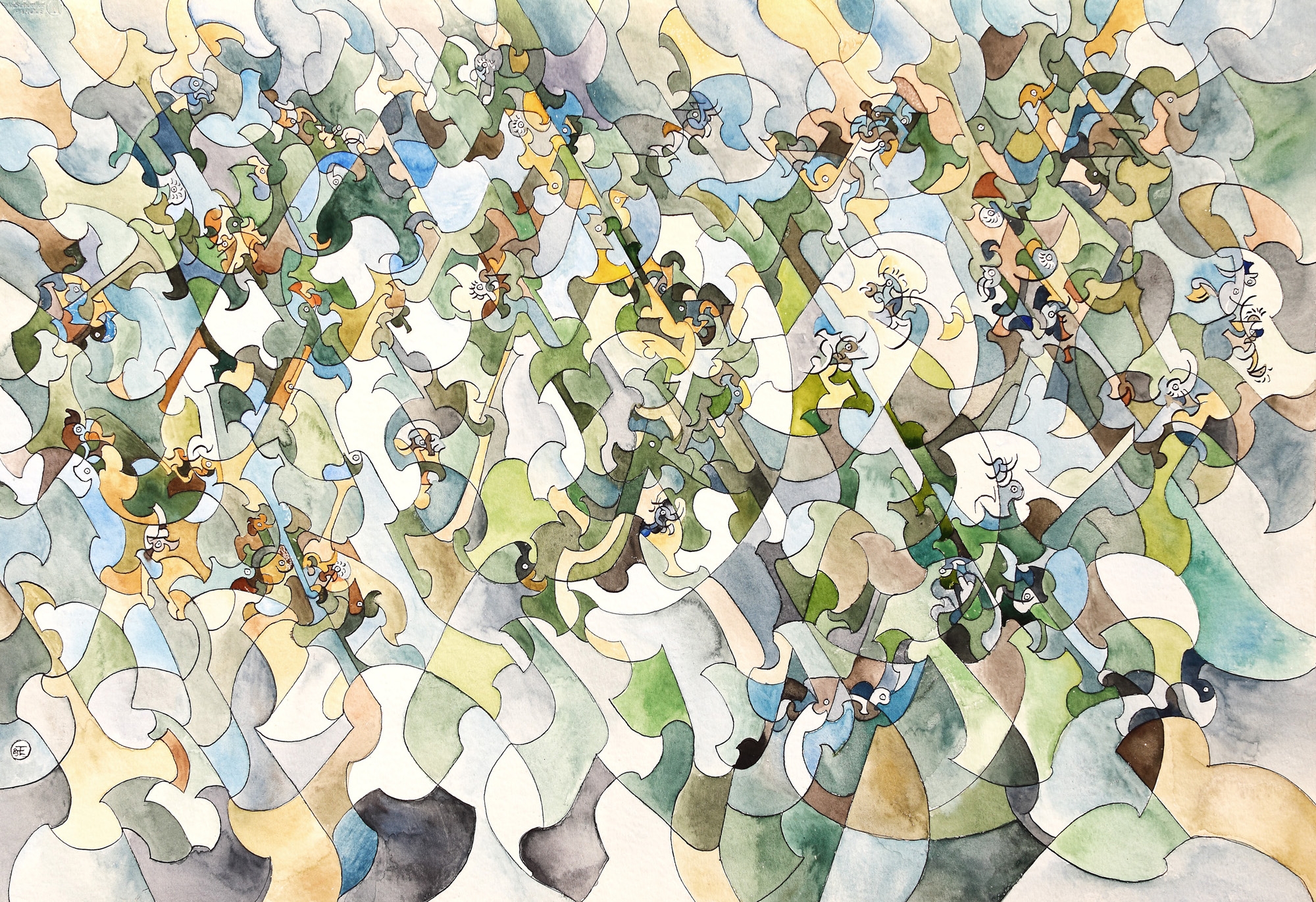 acuarelă și tuș pe hârtie lipită pe carton