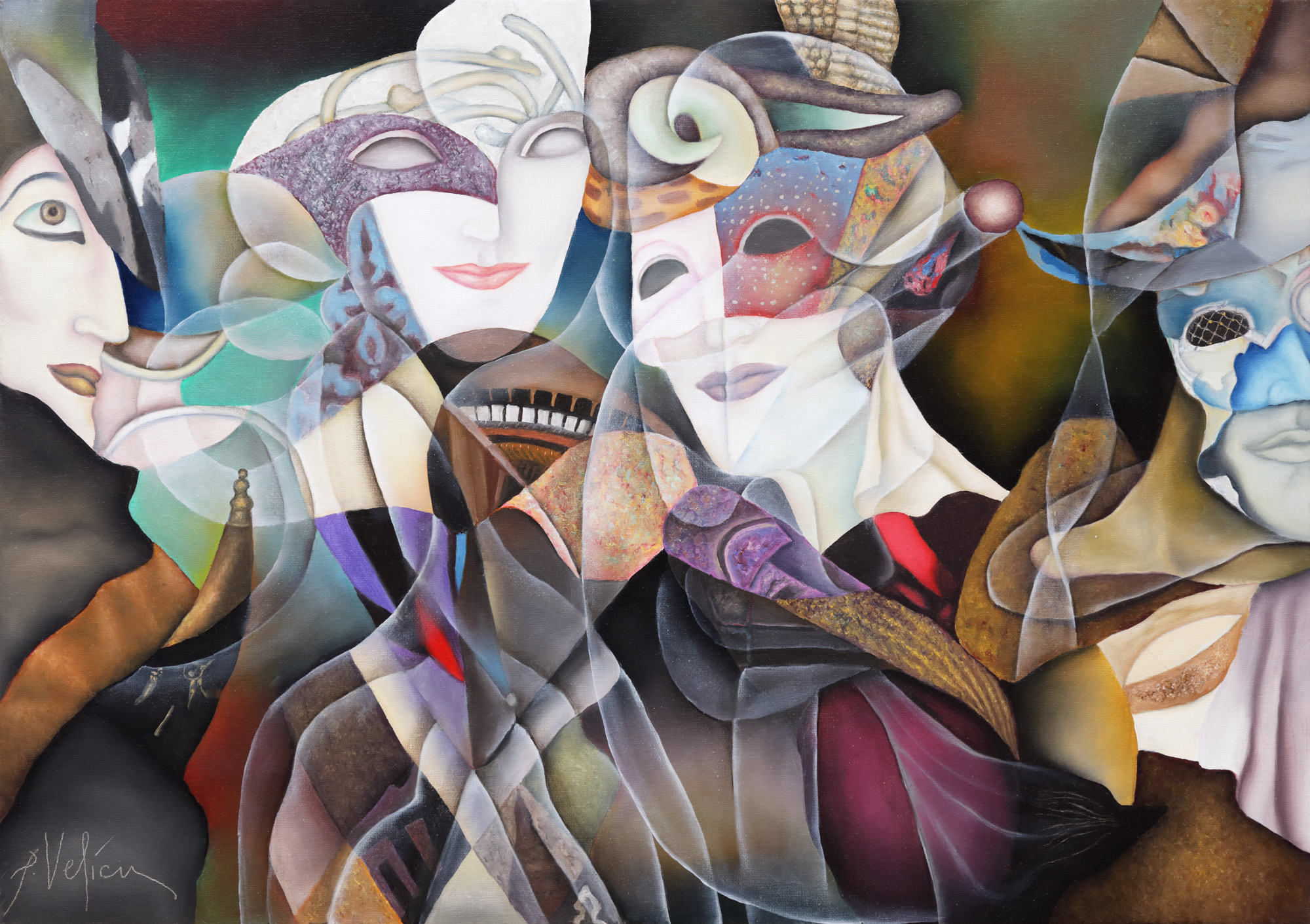 semnat stânga jos cu alb, "P. Velicu"; semnat, datat, localizat și intitulat pe verso, cu negru, ”P. Velicu, (20)21, Paris, Carnaval”