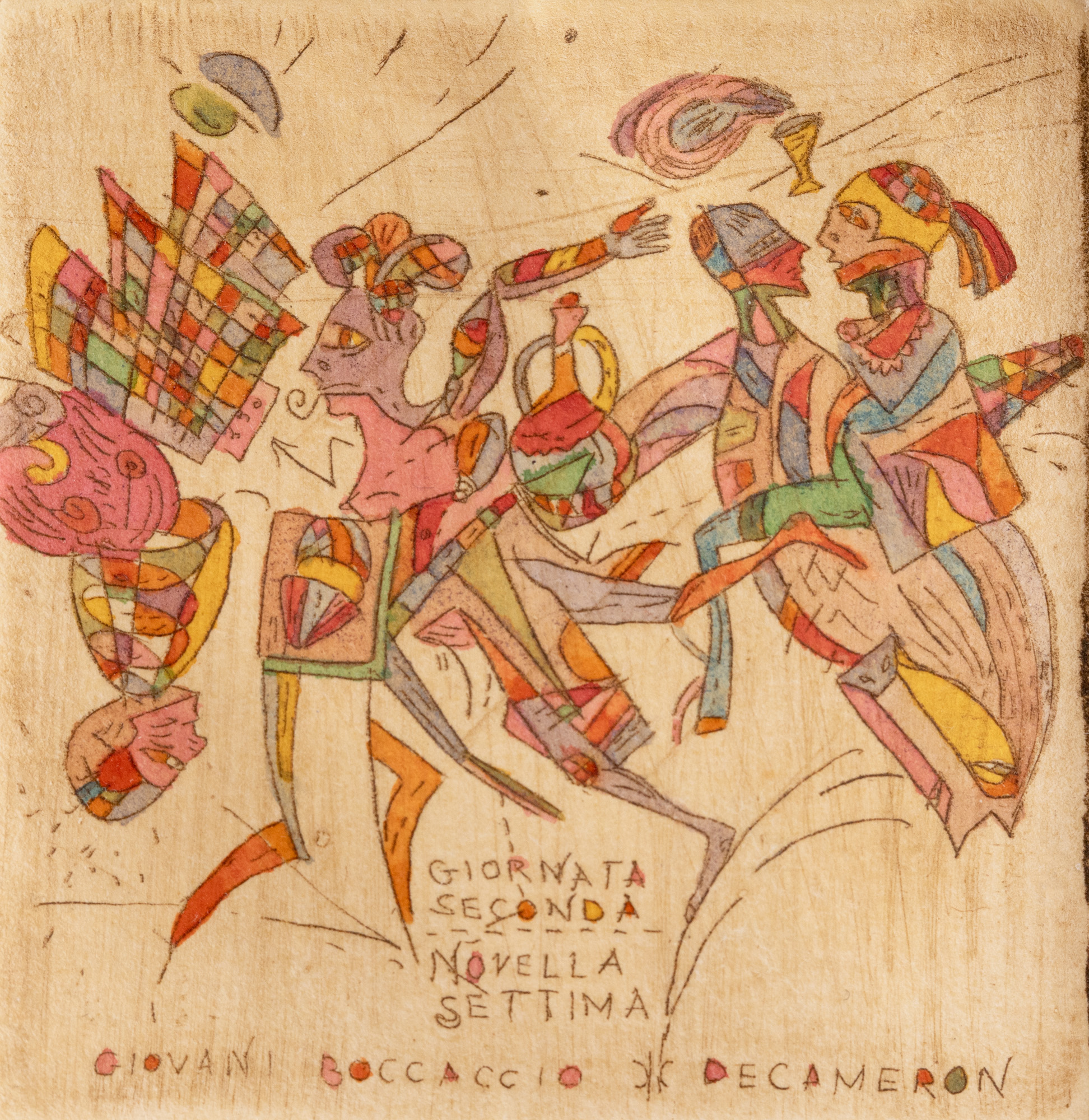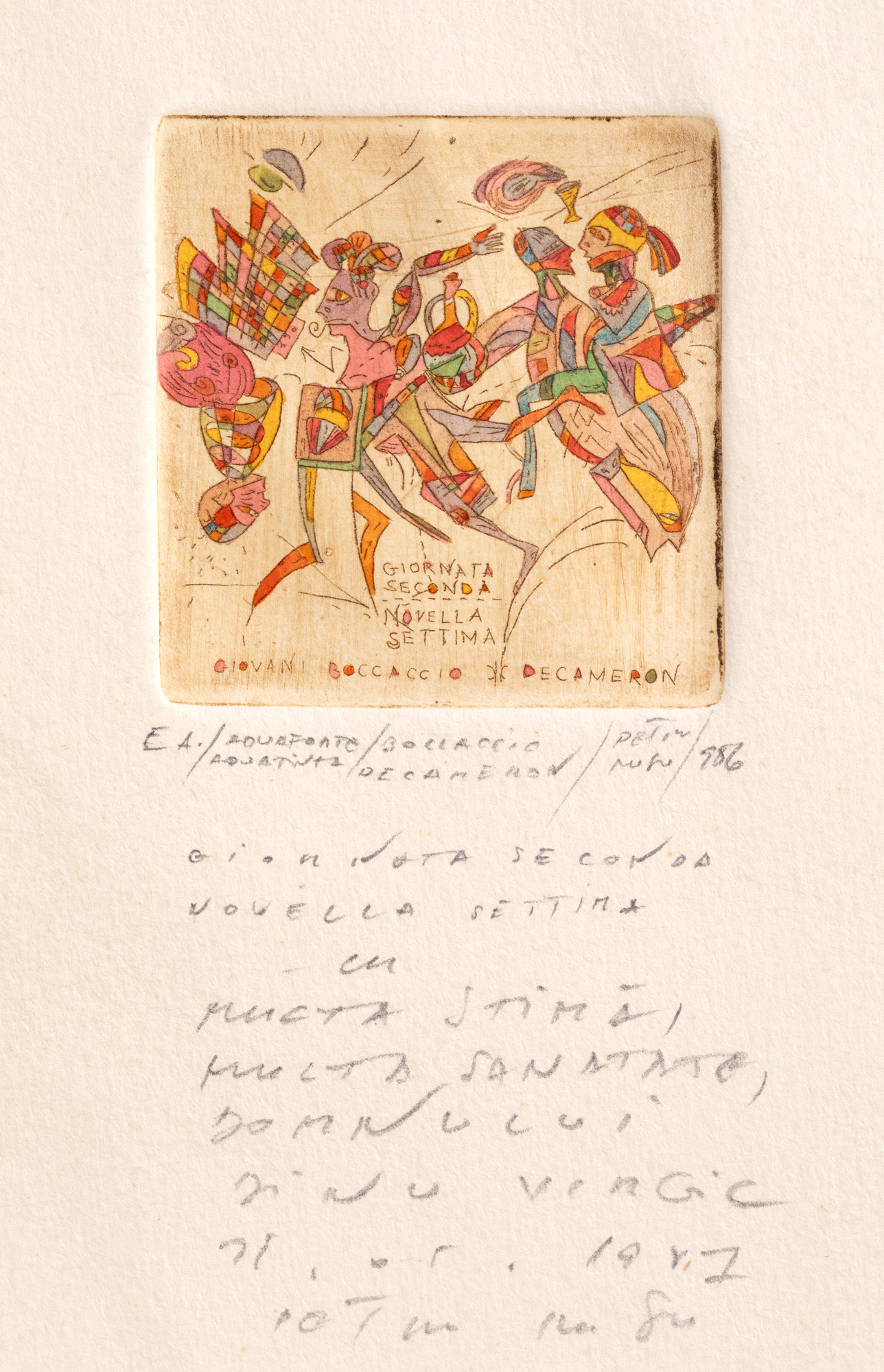 semnat, datat, intitulat și notat central jos, în creion, "Petru Russu, (1)986, Boccaccio-Decameron, E.A."