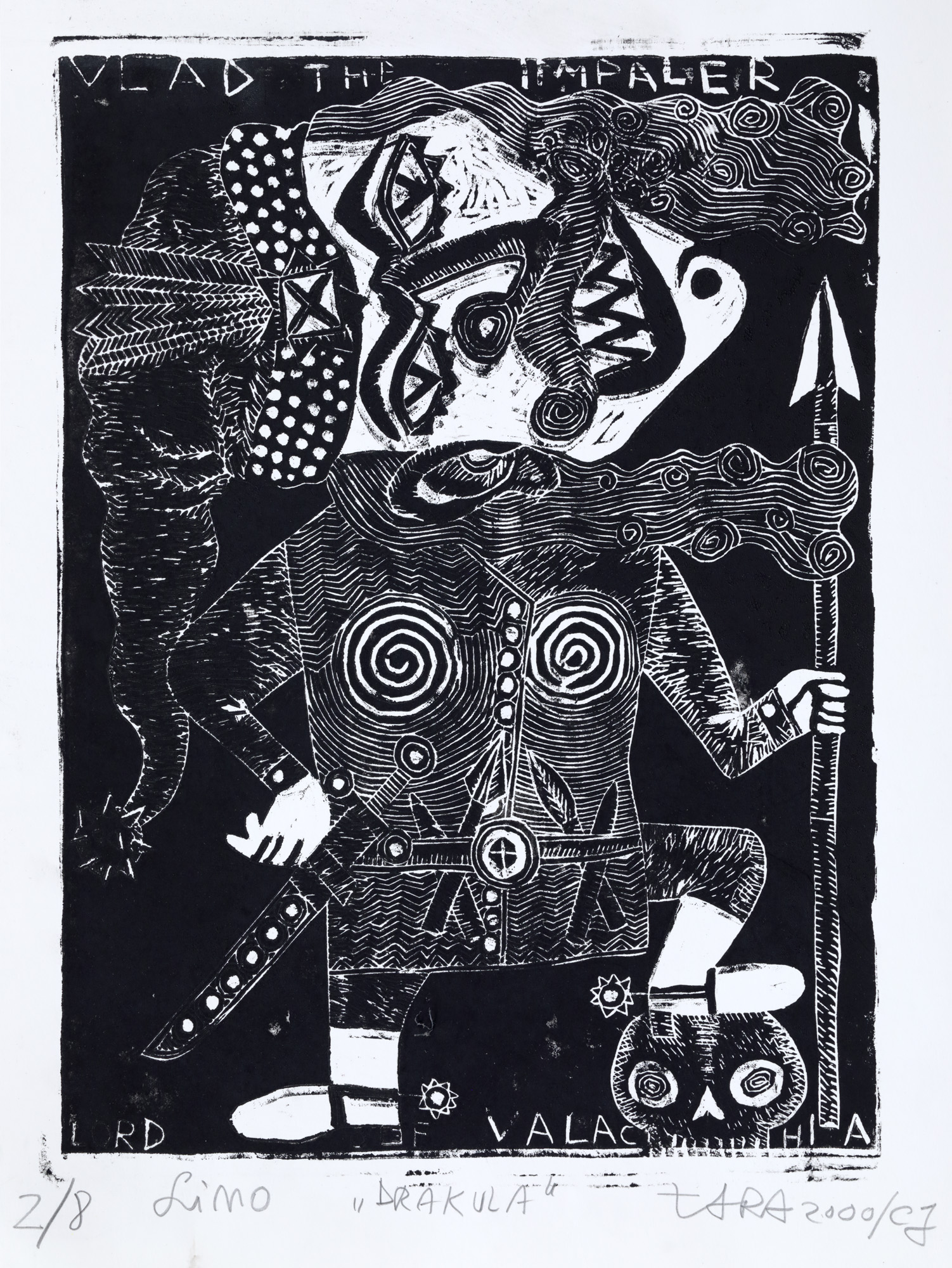semnat, datat, intitulat, localizat și numerotat central jos, în creion, "TARA, 2000, CJ, Drakula, 2/8"