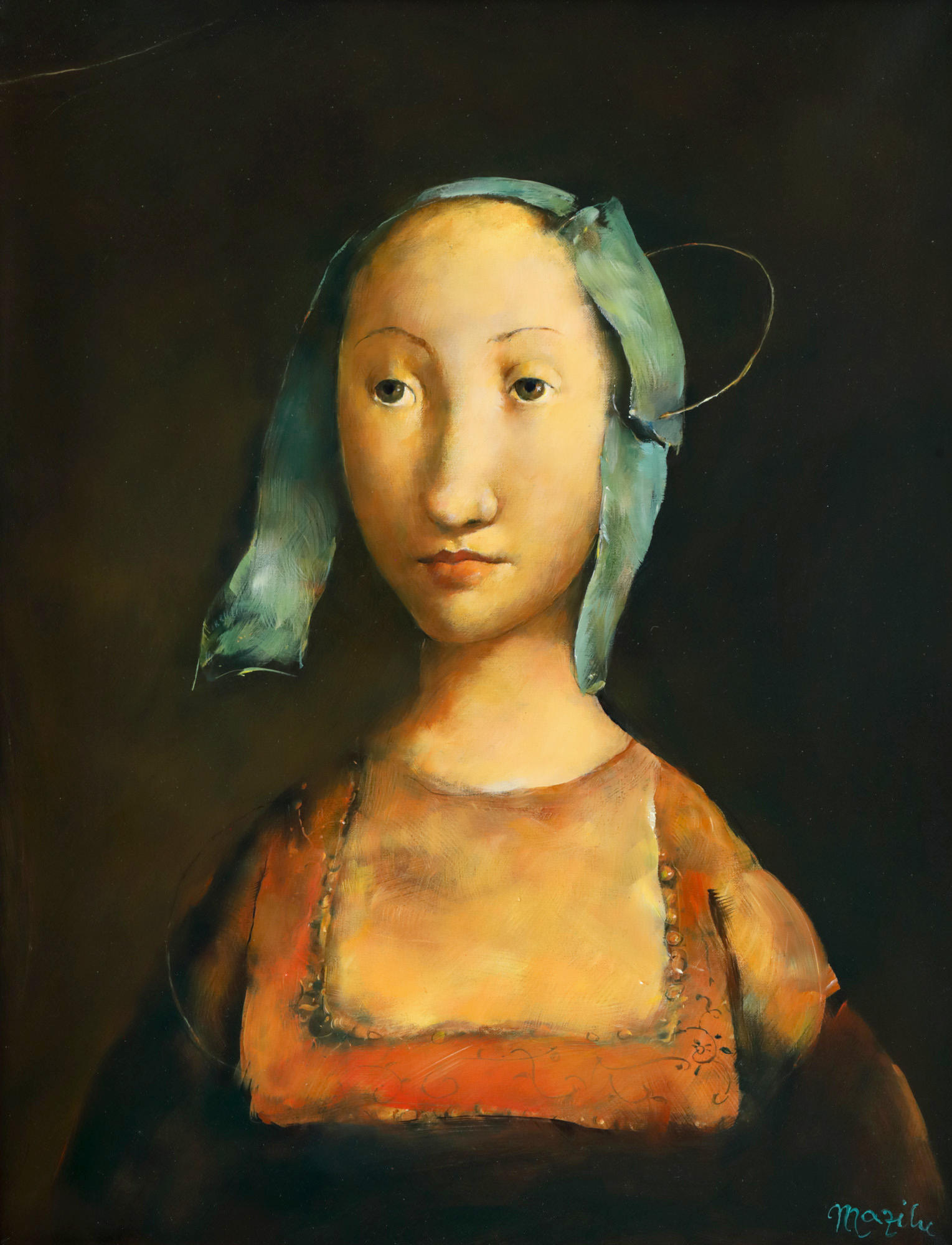semnat dreapta jos, cu albastru, ”Mazilu”; semnat, datat și intitulat pe verso, cu negru, ”Mazilu, Femme à la coiffe bleue, 23.03.(20)20”