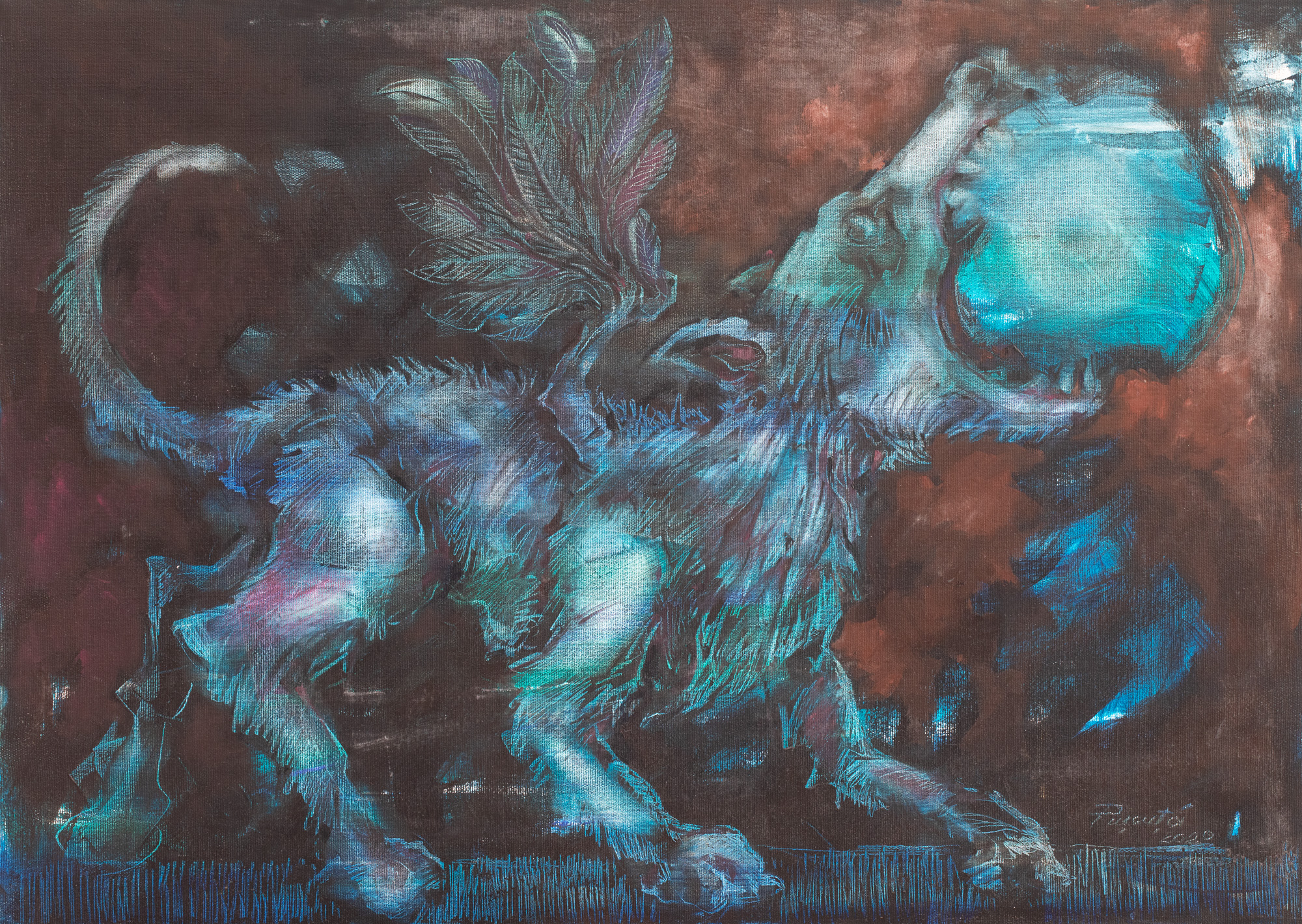 semnat și datat dreapta jos, cu alb, ”Pușcuță, 2020”; semnat, datat, intitulat și localizat pe verso, cu negru, ”Pușcuță Dionis, Lup & lună, 2020”