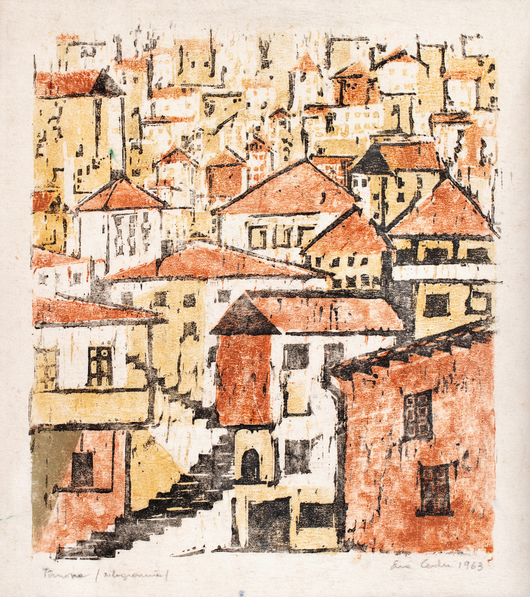 semnat și datat dreapta jos, în creion, ”Eva Cerbu, 1963”; localizat și notat stânga jos, în creion, ”Târnovo, xilogravură”
