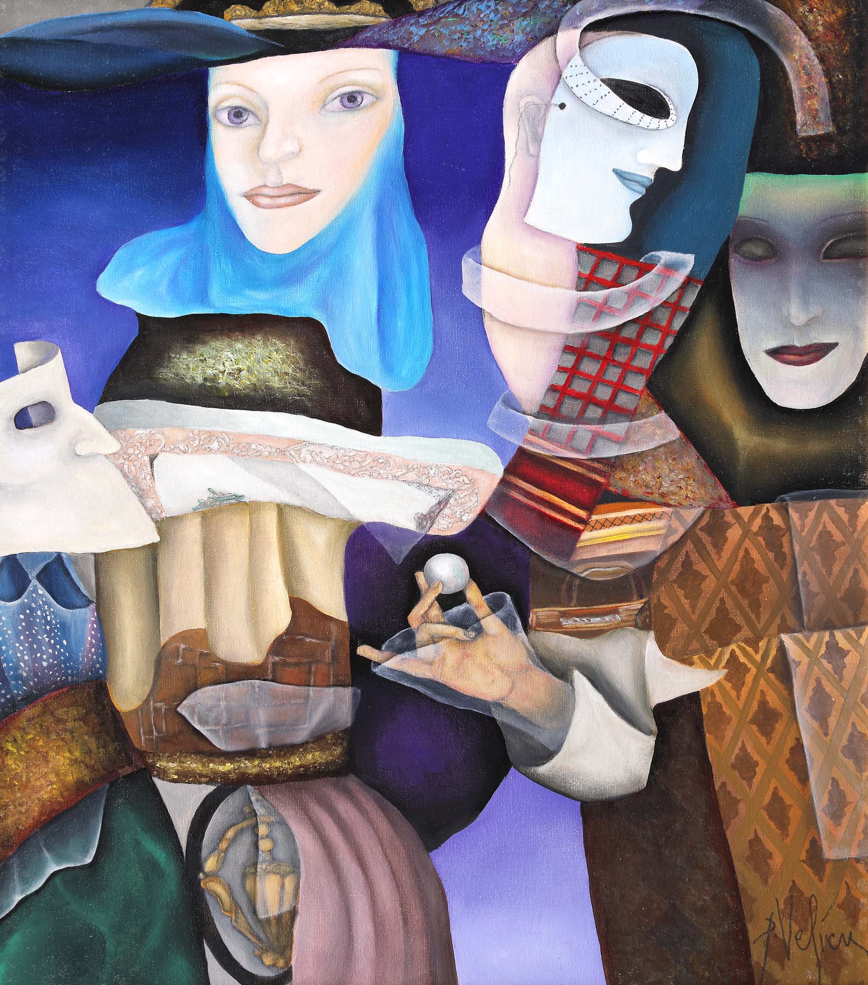 semnat dreapta jos, cu negru, "P. Velicu", semnat, datat, localizat și intitulat pe verso, cu negru, "P. Velicu, Carnaval, 2020, Paris"