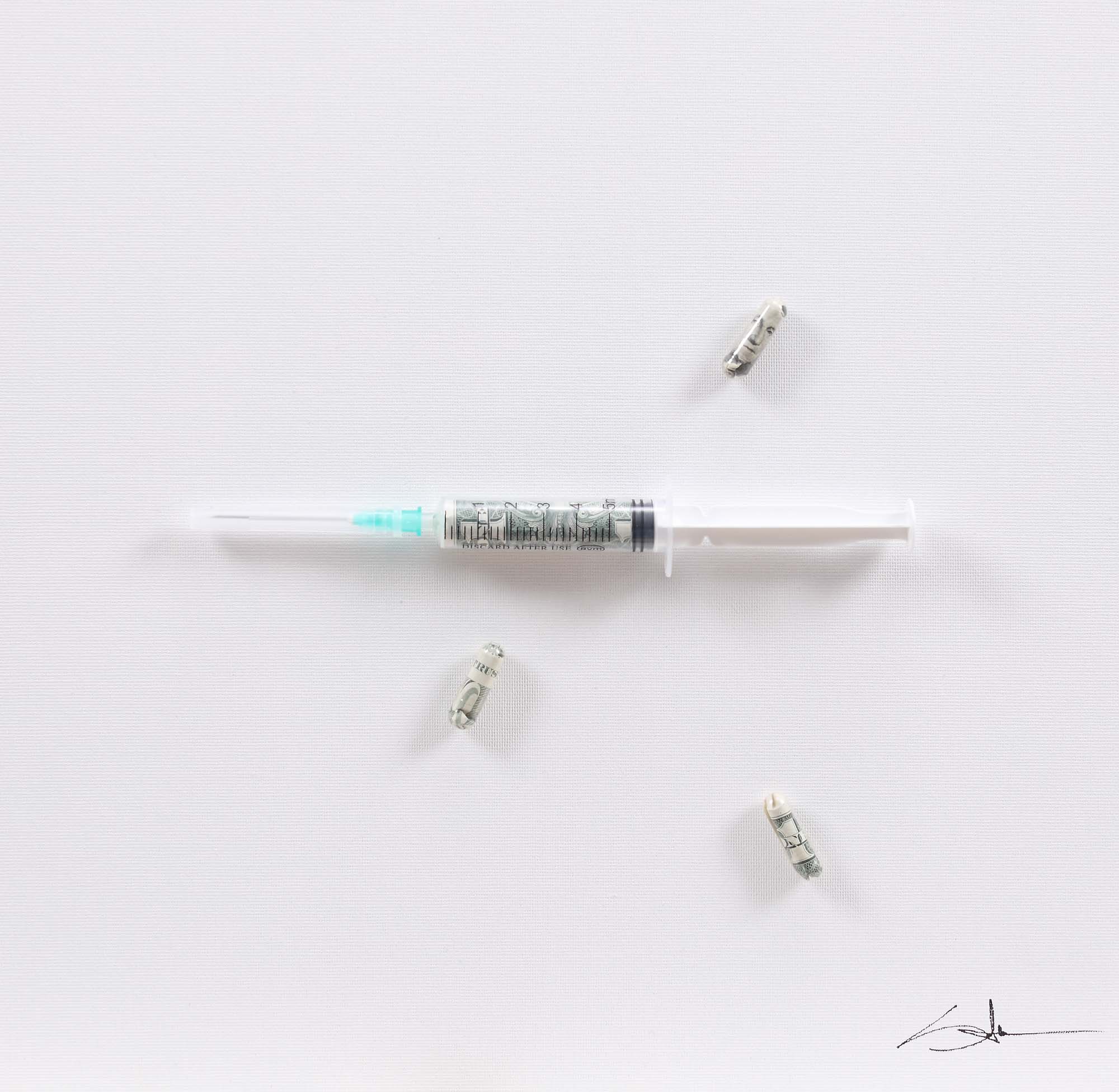 seringă, medicamente și dolari