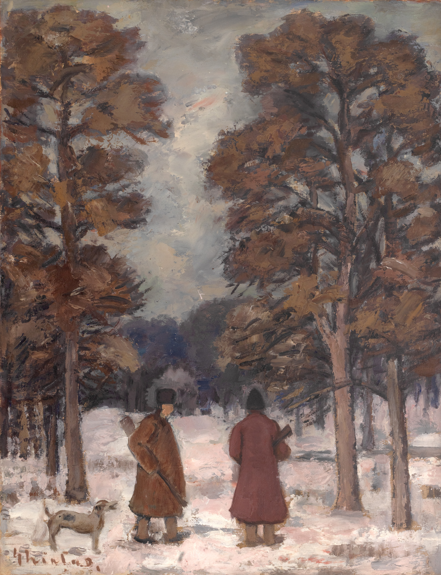 Opera a făcut parte din expoziția "Peisajul în pictura românească", Muzeul Național Cotroceni, București, 2002. Opera este reprodusă în monografia "Dumitru Ghiață", prefață de A.E.Baconsky, Ed. Meriadiane, București, 1966, cat. 31, sub titlul "Vânători în pădure".