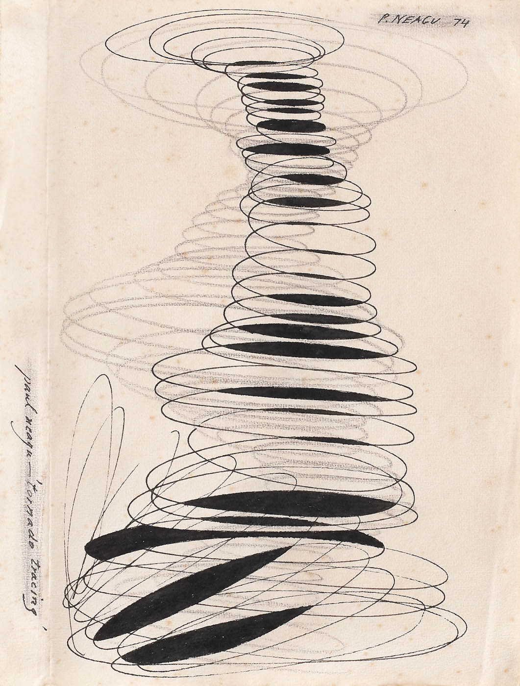 semnat și datat dreapta sus, cu negru, "P. NEAGU, (19)74"; semnat și intitulat lateral stânga, cu negru, "Paul Neagu, Tornedo Tracing"