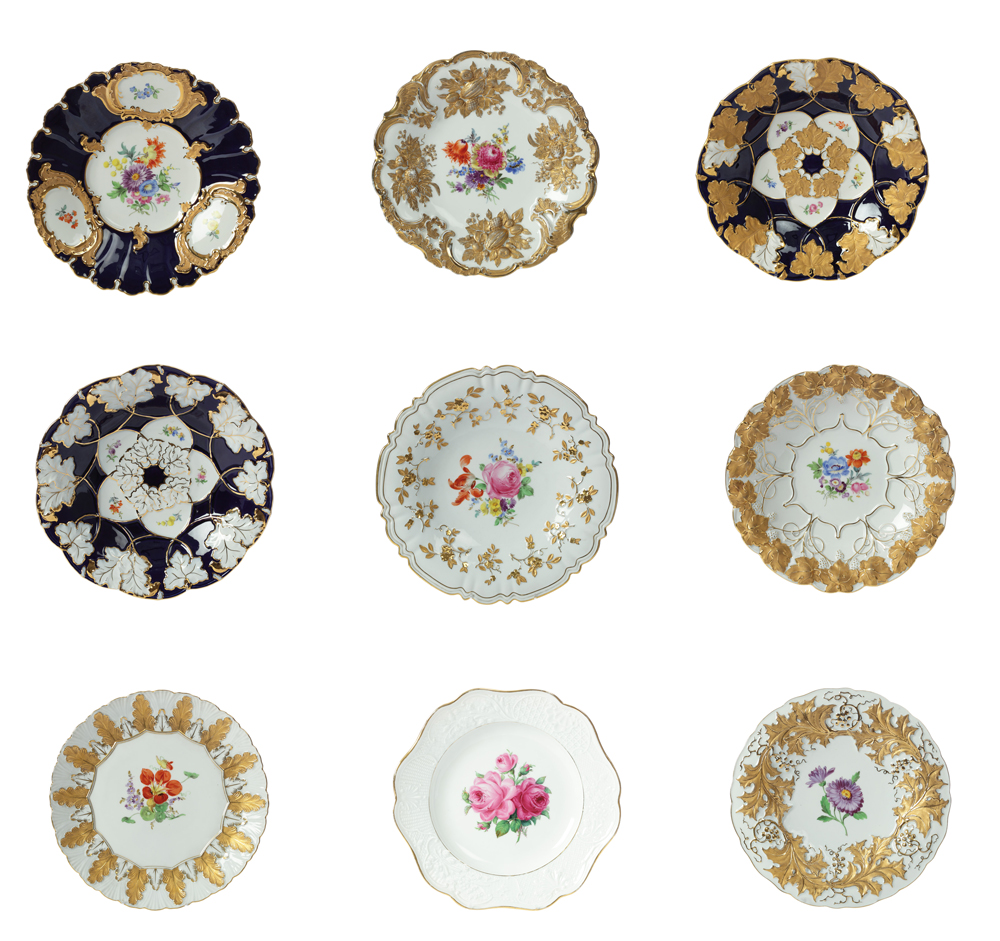 37. Colecție de platouri de servit Meissen, decorate cu email și aur, cca 1924-1934