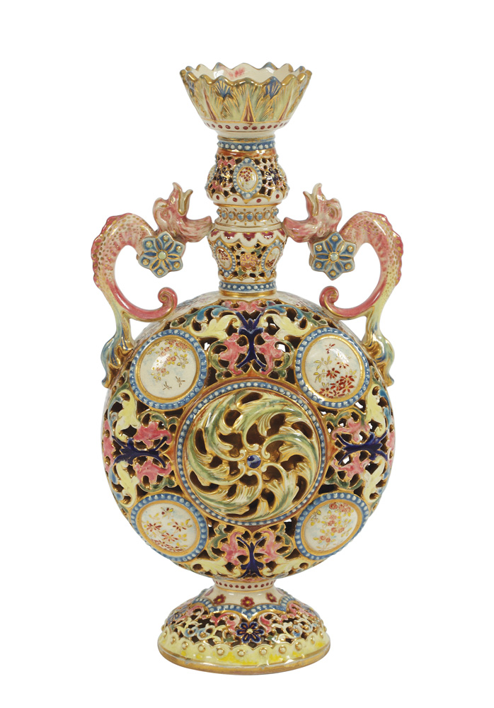 Vasul decorativ pe talpă circulară și picior mărunt are corpul circular, aplatizat, amintind de plosca tradiţională. De gâtul lung se prind cele două anse, al căror decor sub formă de dragoni continuă tema preponderentă, supra-încărcată cu motive vegetale și decorații diverse, caracteristice manierei lui Fischer.