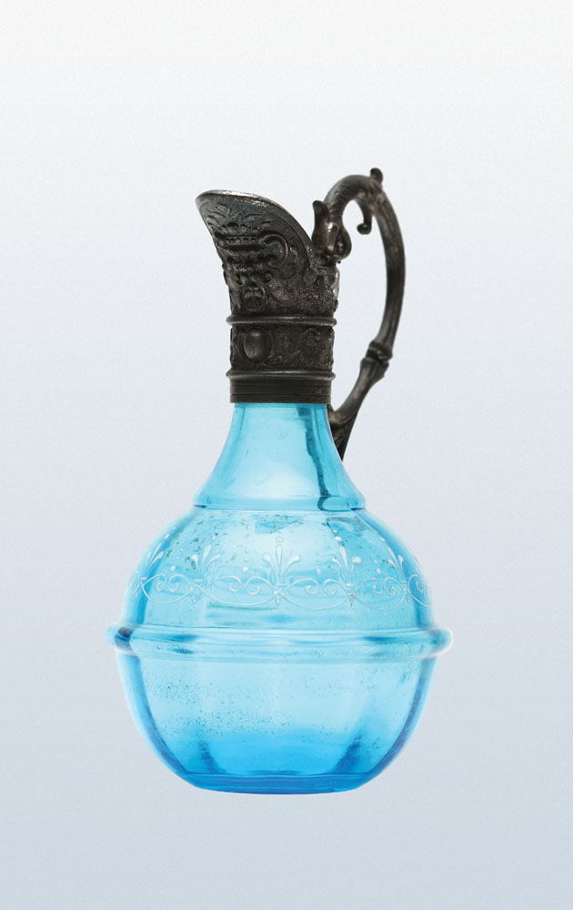 Sticlă pictată fin cu motiv floral stilizat, are partea superioară în întregime din metal, cu ansă amplă și țurțur decorat cu mascheron.