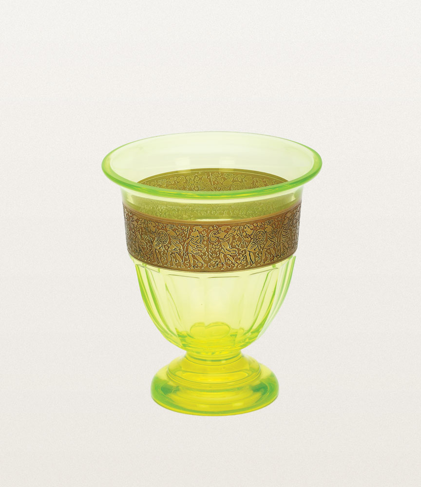 cristal turnat, fațetat, șlefuit, de culoare galben-verzui, metal coloidal, gravat cu acizi