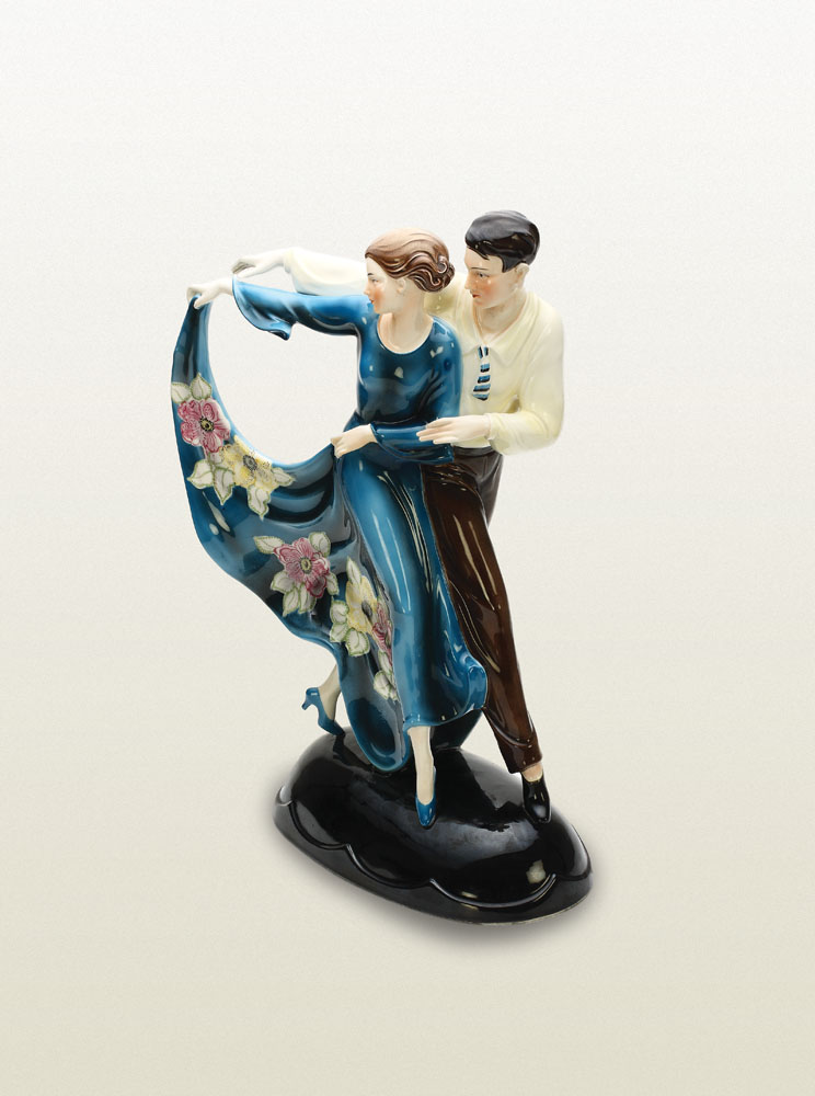 Grup de dansatori în mișcare amplă, grațioasă. Caracteristic producției de porțelan al manufacturii turingiene, grupul figurativ se remarcă prin mișcarea elansată și cromatica vie, veselă. Piesă caracteristică decorativismului figurativ al stilului Art Deco.
