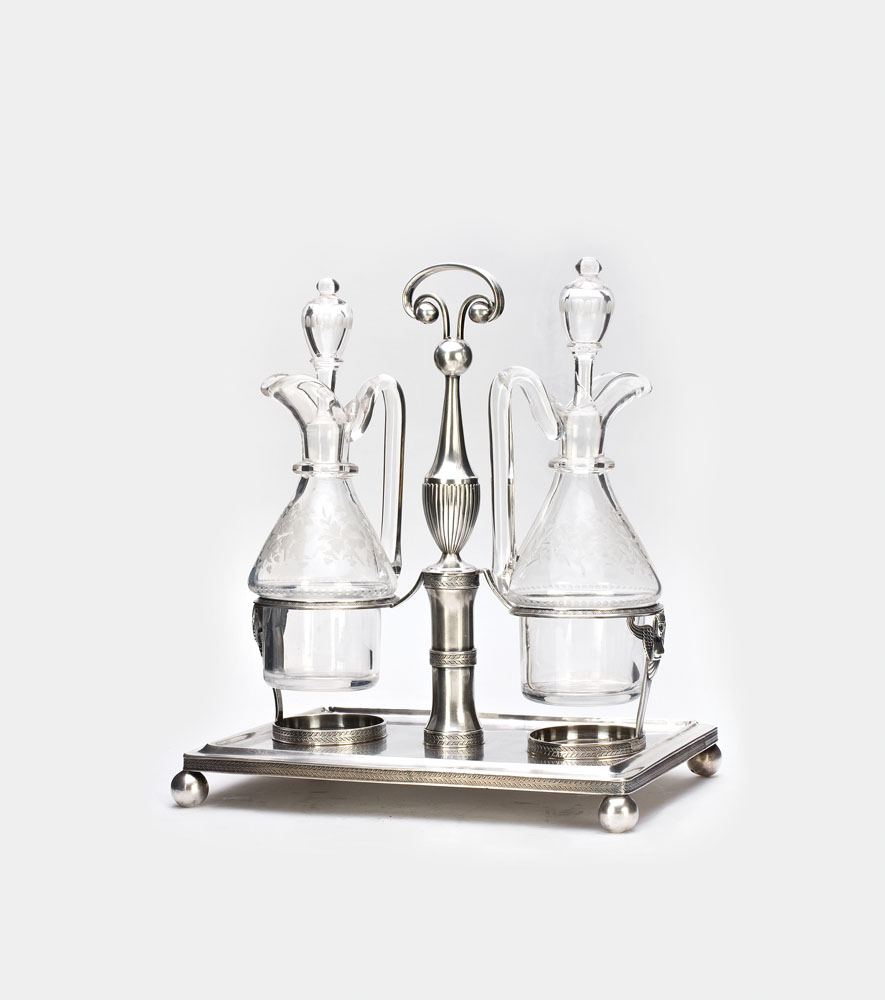 Tavă dreptunghiulară din argint, lisă, cu bordură interioară reliefată, pe patru piciorușe-sfere reduse, central cu tijă-mâner, balustru, terminat cu motiv ”champignon” cu 3 bile; de o parte și de cealaltă două recipiente din sticlă, gravată fin cu buchete de flori mărunte, corp bulbat, strâns la baza gâtului cu inel circular, gât cilindric cu țurțur lat, ansă supraînălțată și dop piriform cu decor brâu fațetat, în montură din benzi de argint, cuprinzând mijlocul piesei și fixarea pe tavă și mâner.