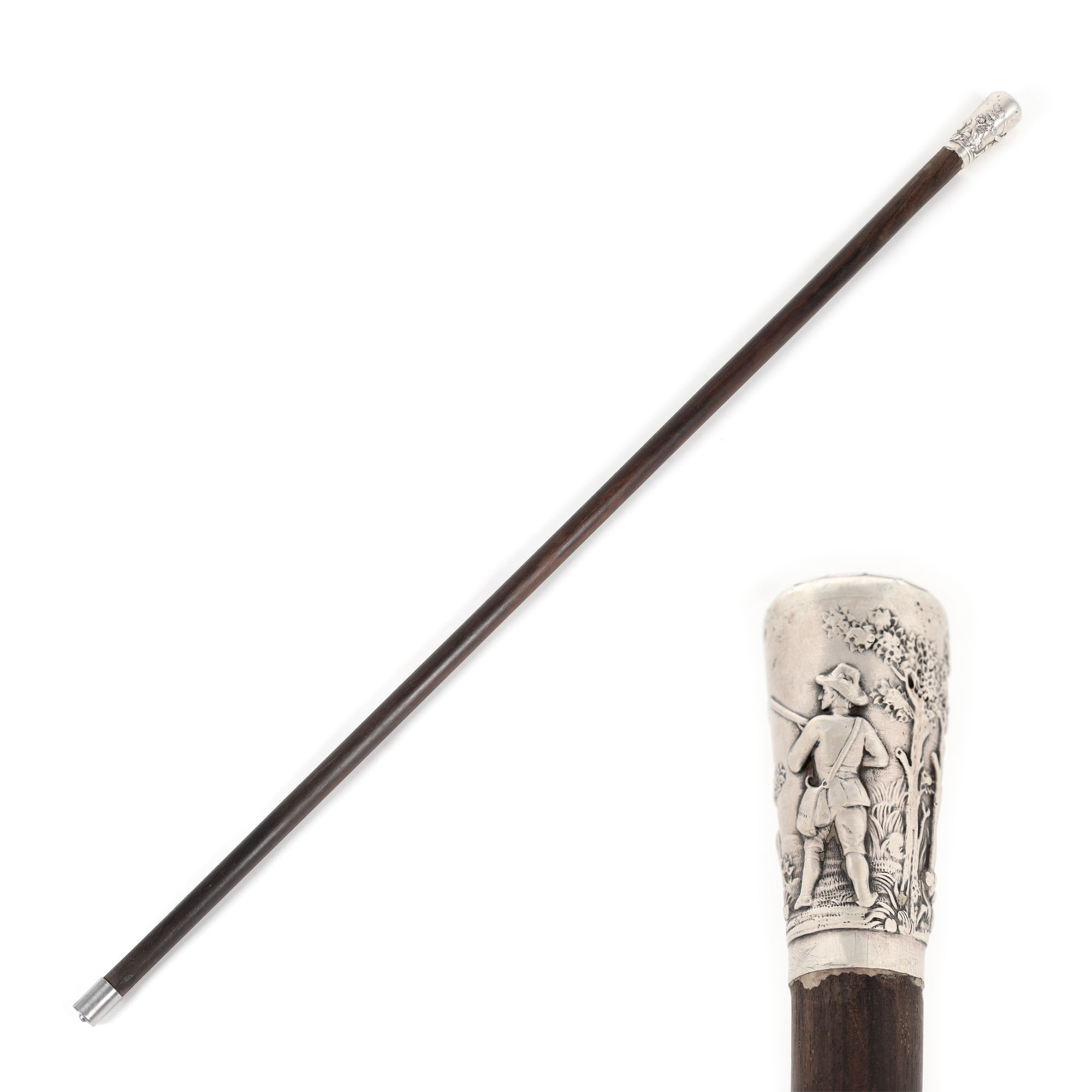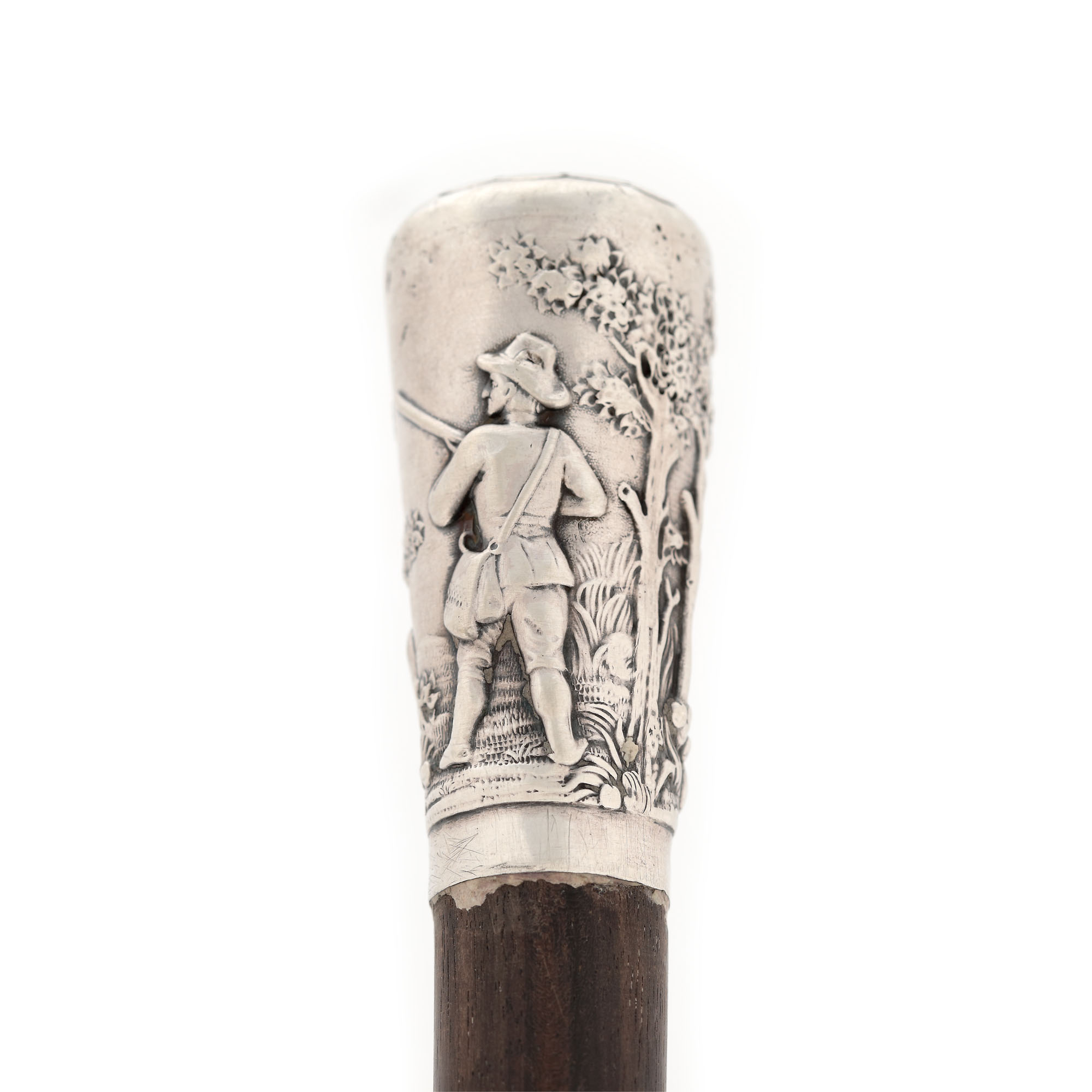 95. Baston din lemn, cu mâner din argint, gravat cu scenă de vânătoare, cca. 1900