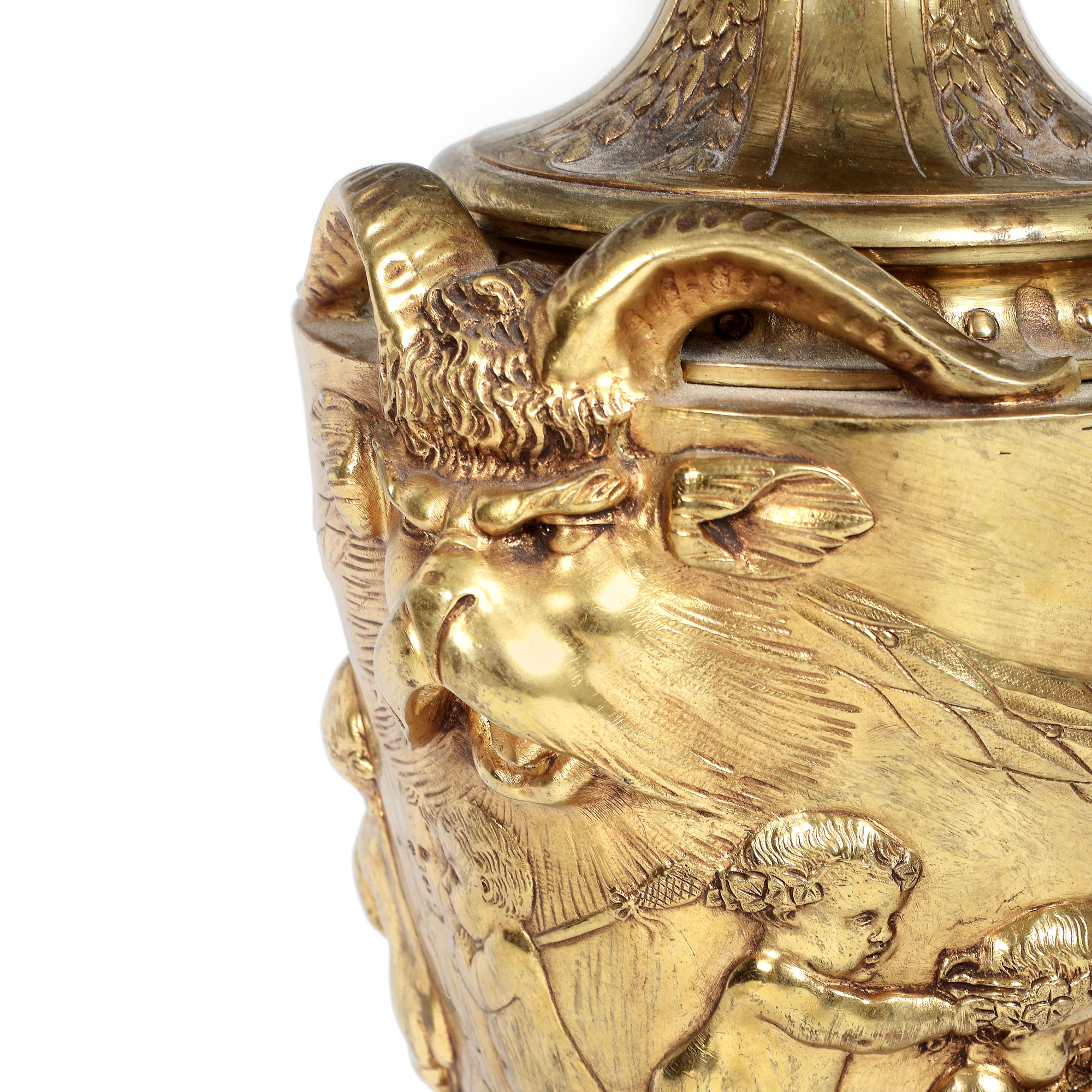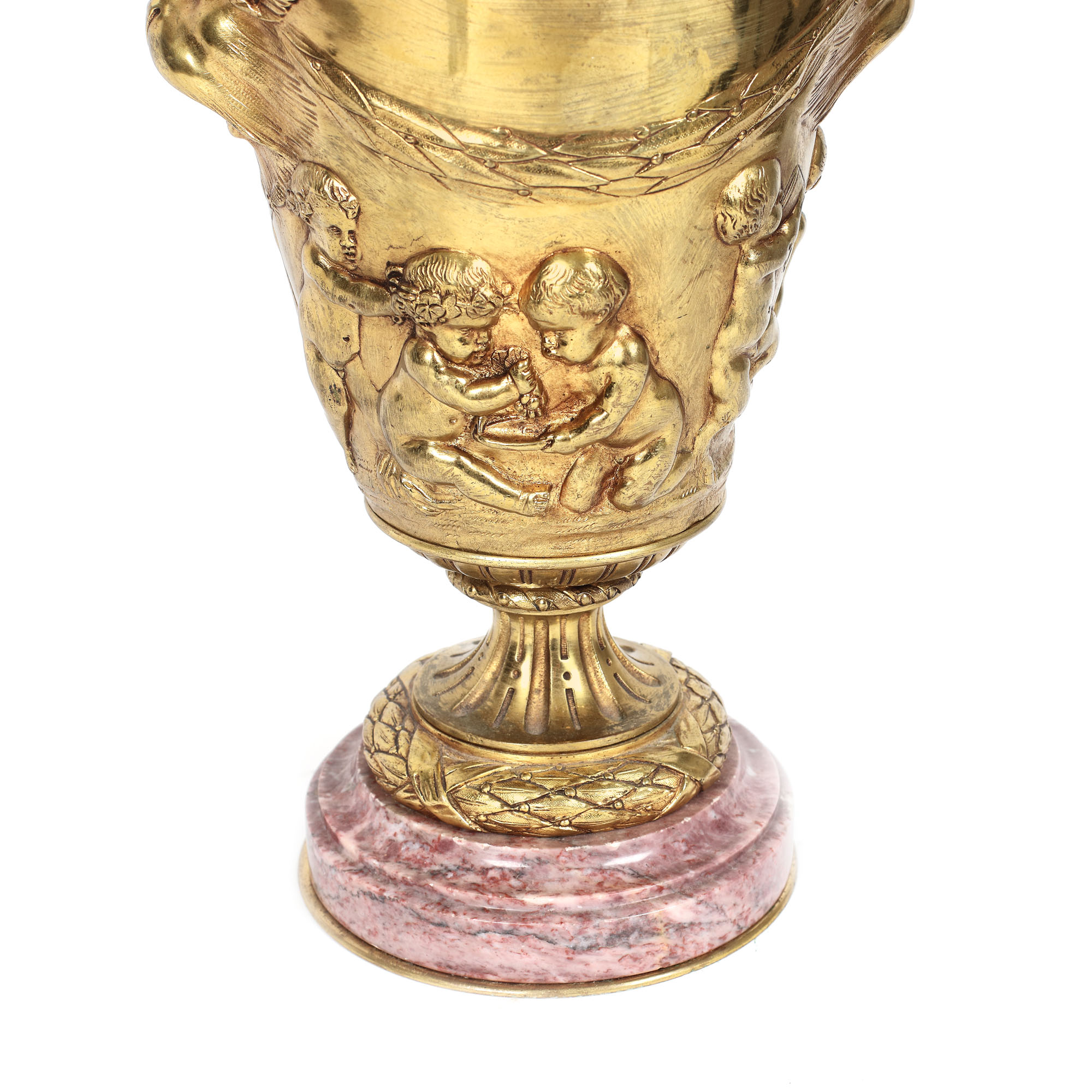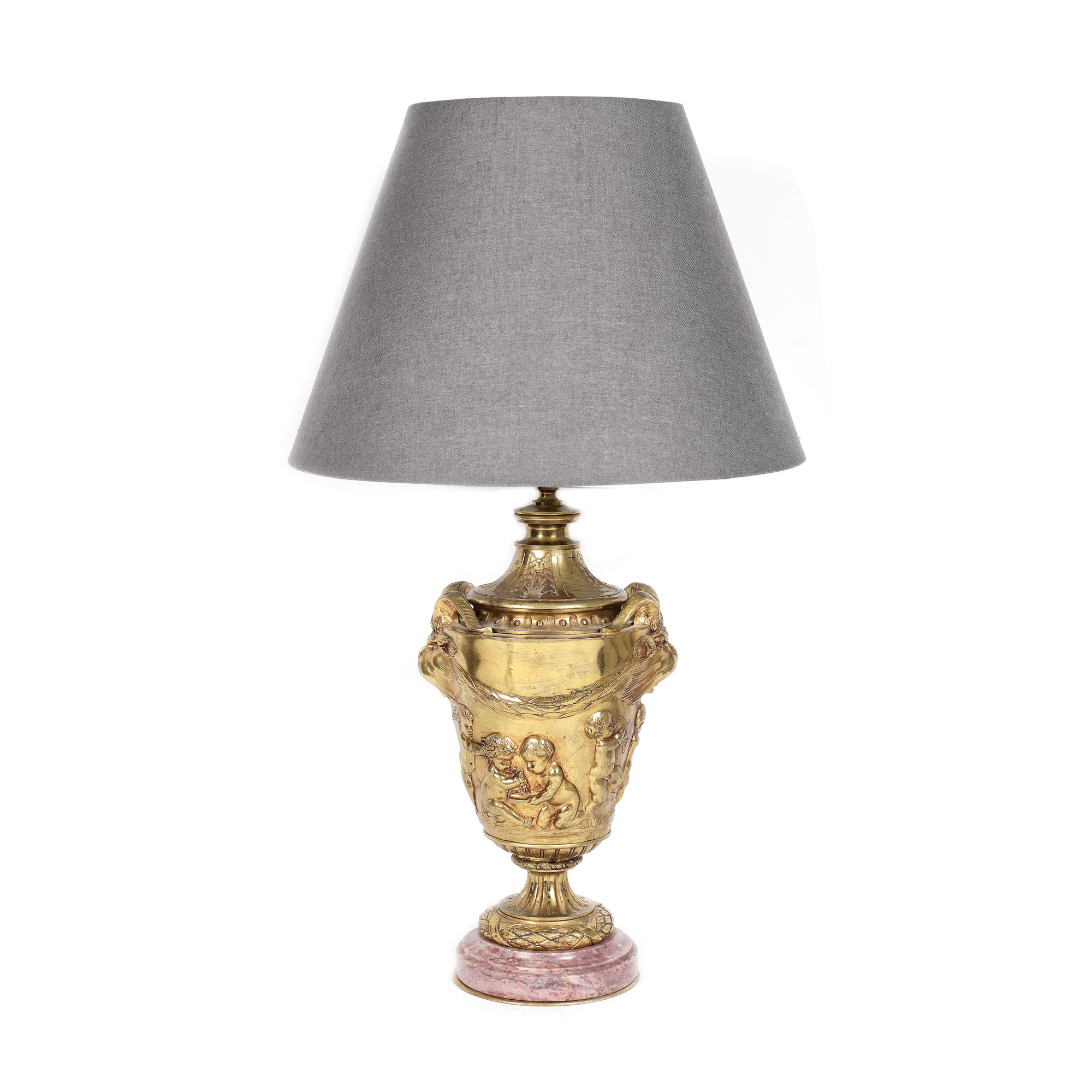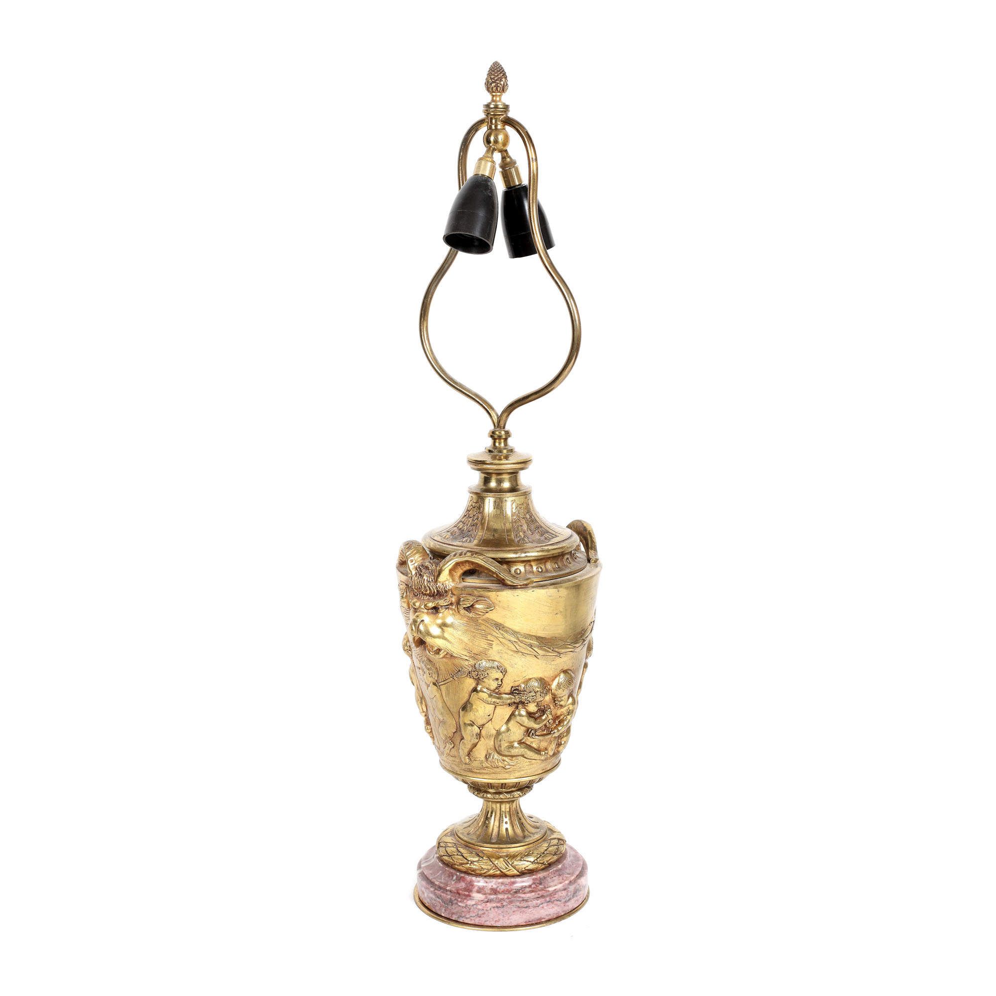 75. Lampă din bronz doré și bază din marmură roșie, decorată cu satiri, putti și cununi de lauri